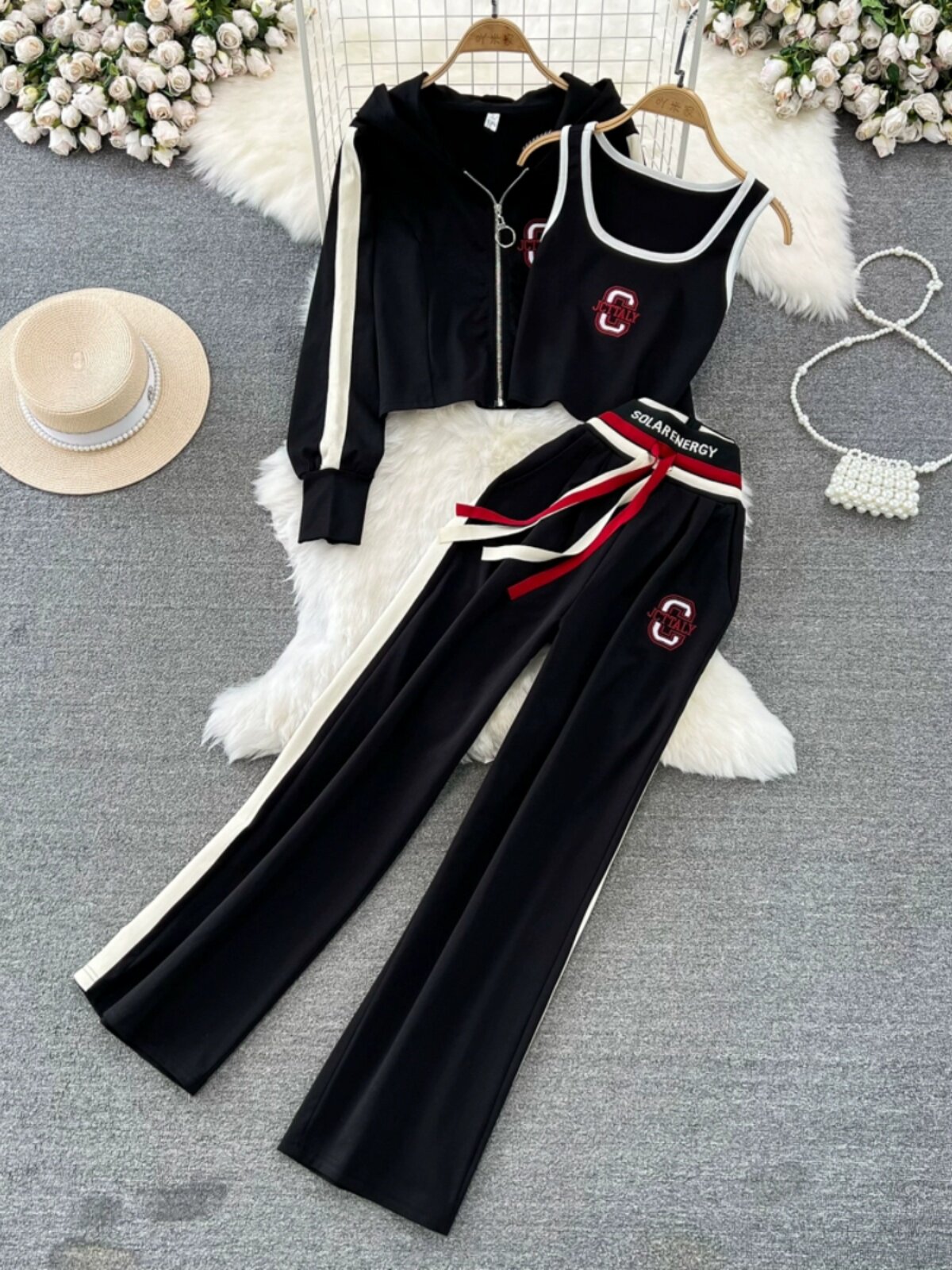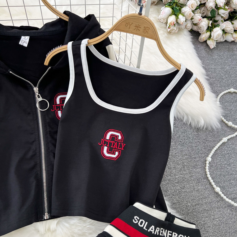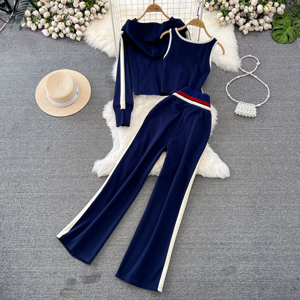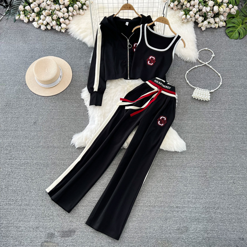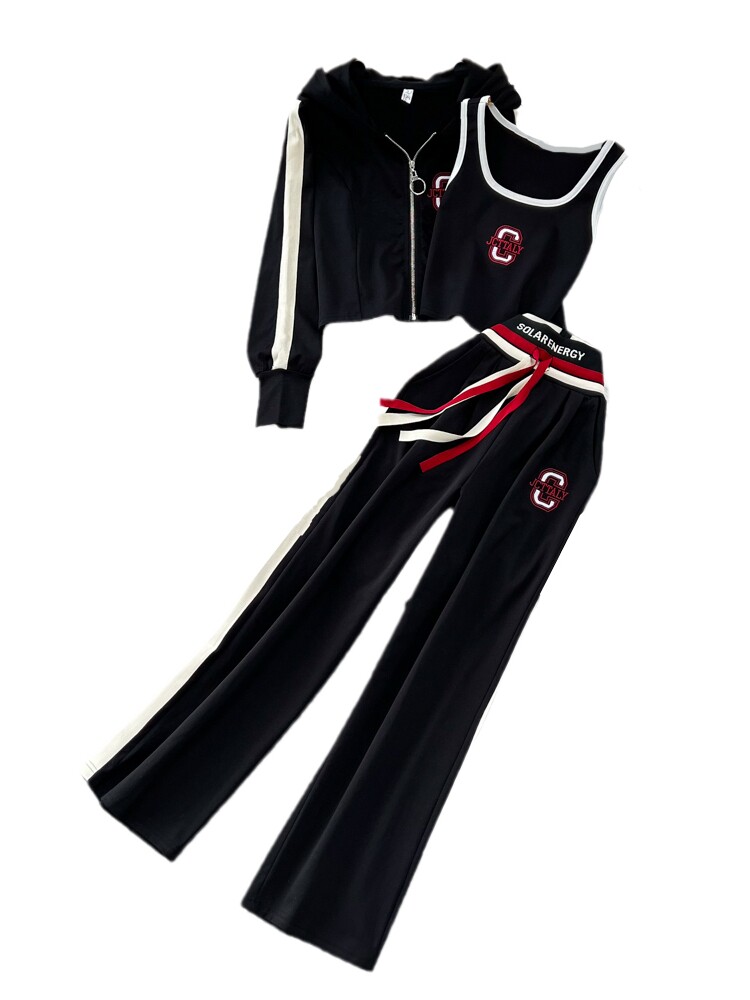 Комплект с молнией, толстовка с капюшоном, жилет, приталенные штаны, 3 предмета, высокая талия, свободный прямой крой