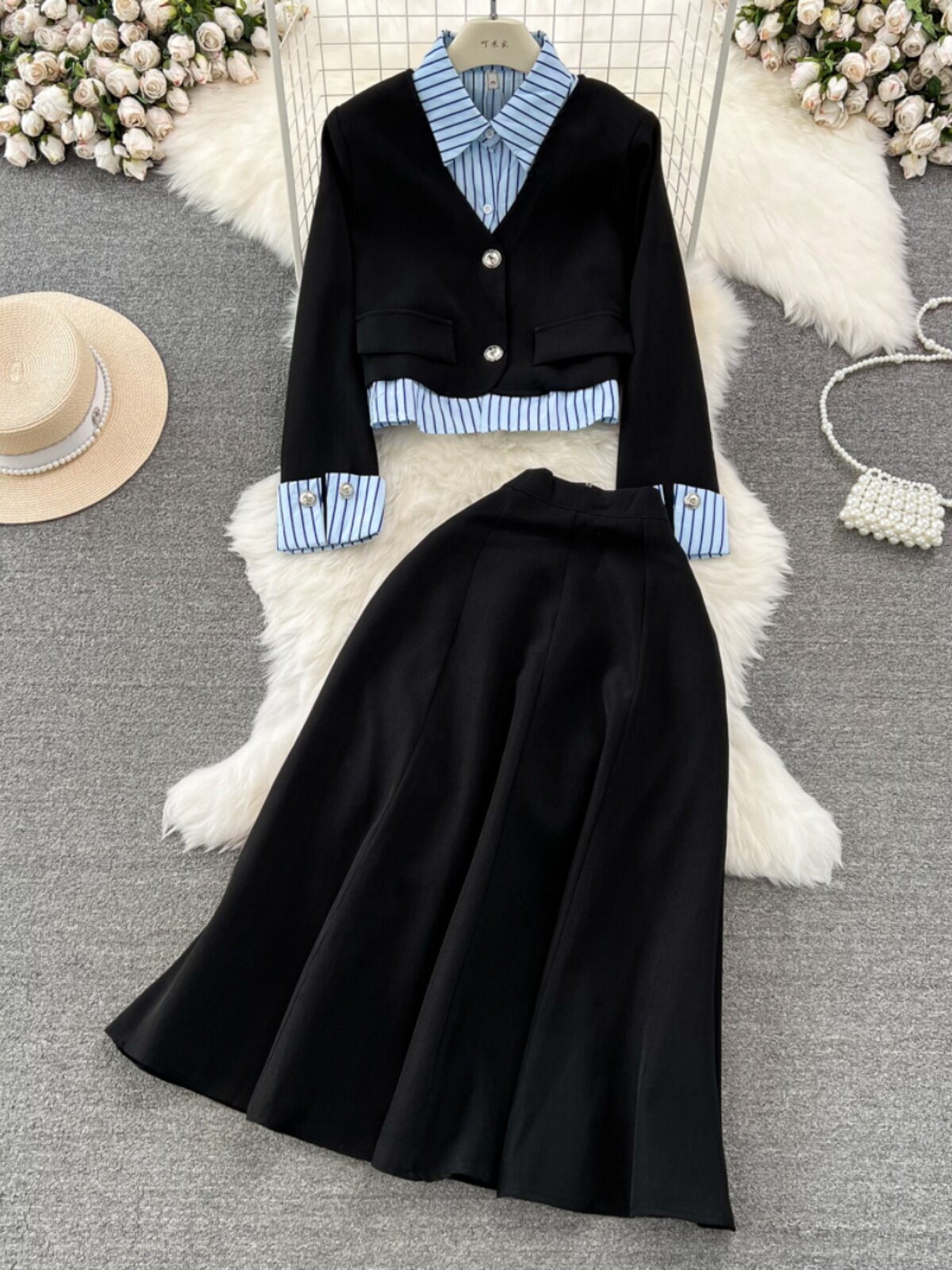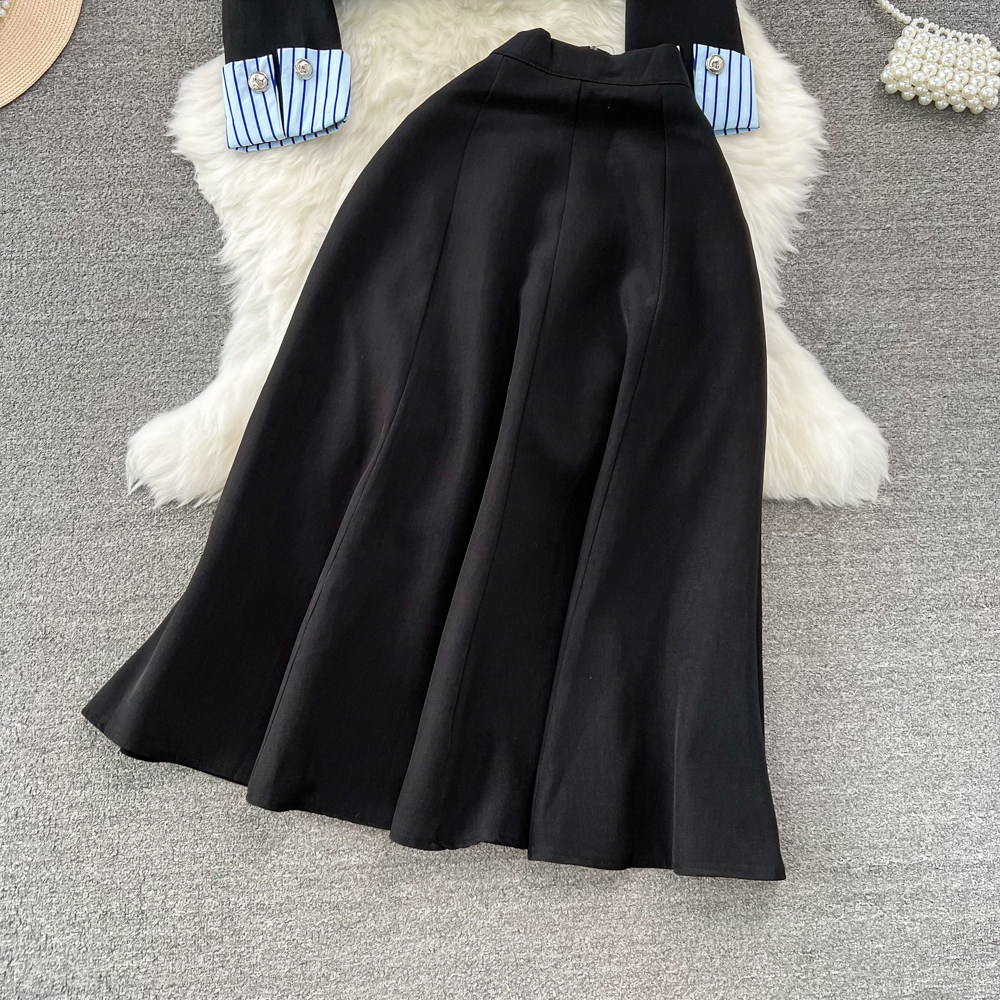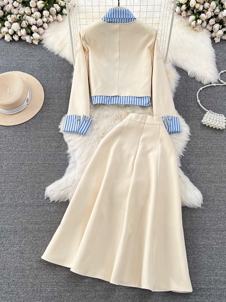 Дизайнерский комплект, костюм, юбка, тренд сезона, воротник поло, высокая талия