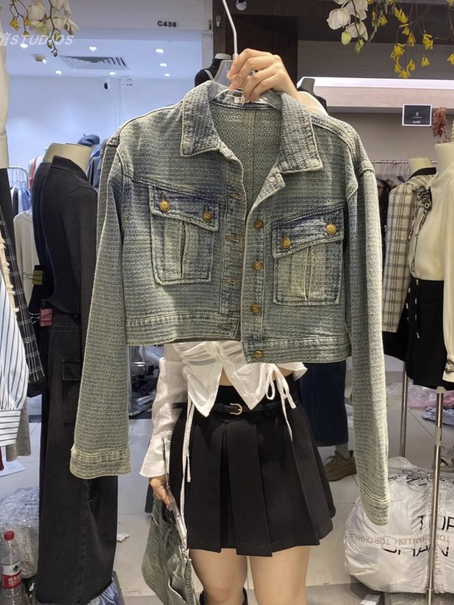 Модный джинсовый осенний комплект, модная джинсовая юбка, куртка, мини-юбка, свободный крой, высокая талия