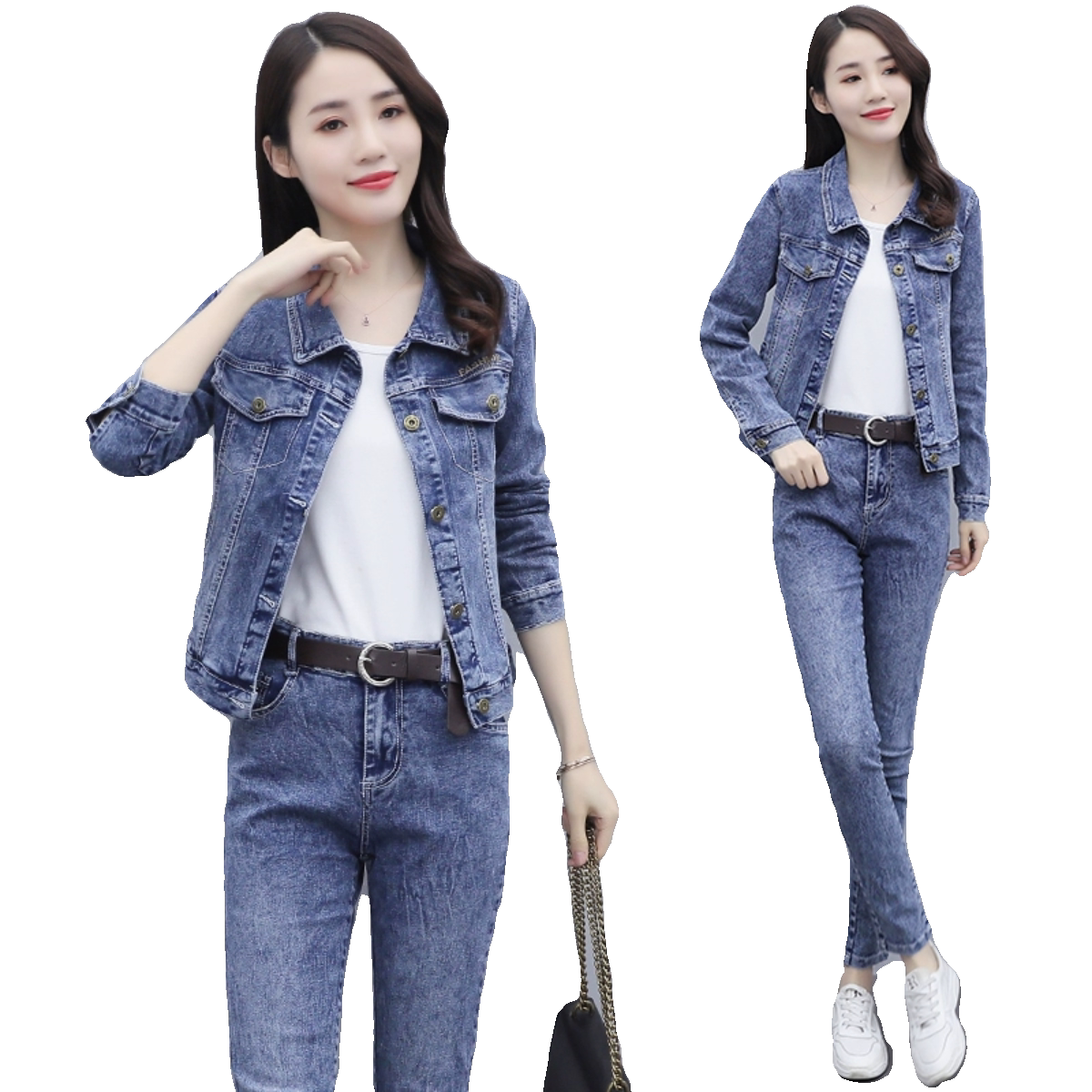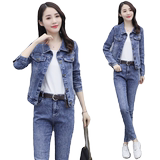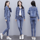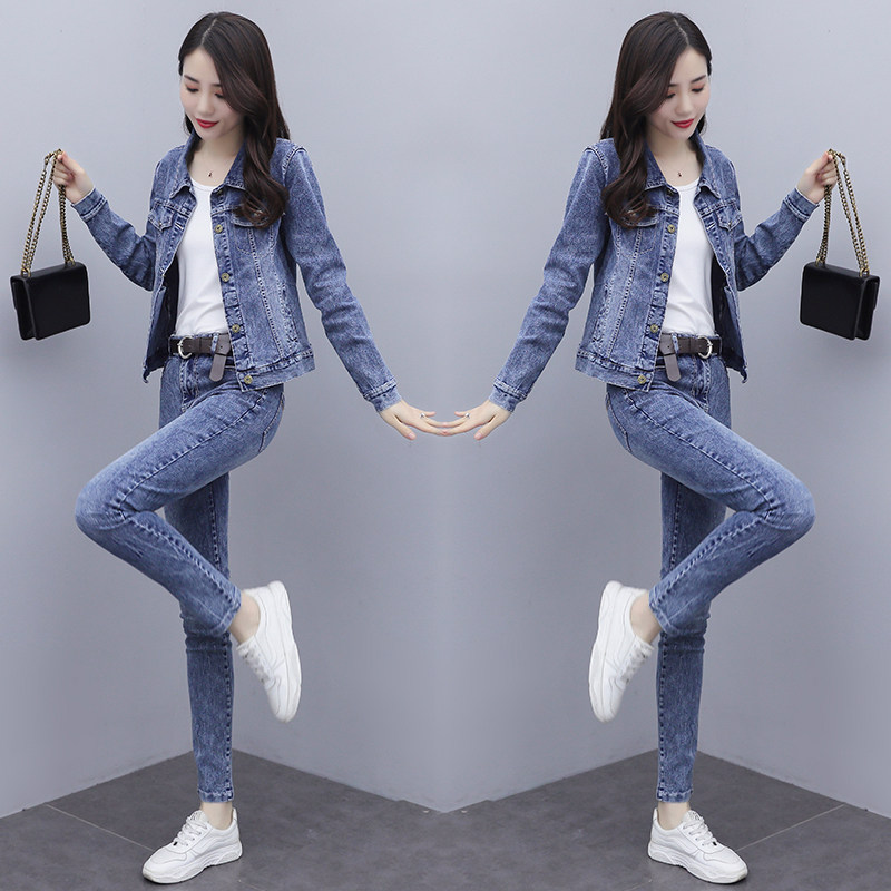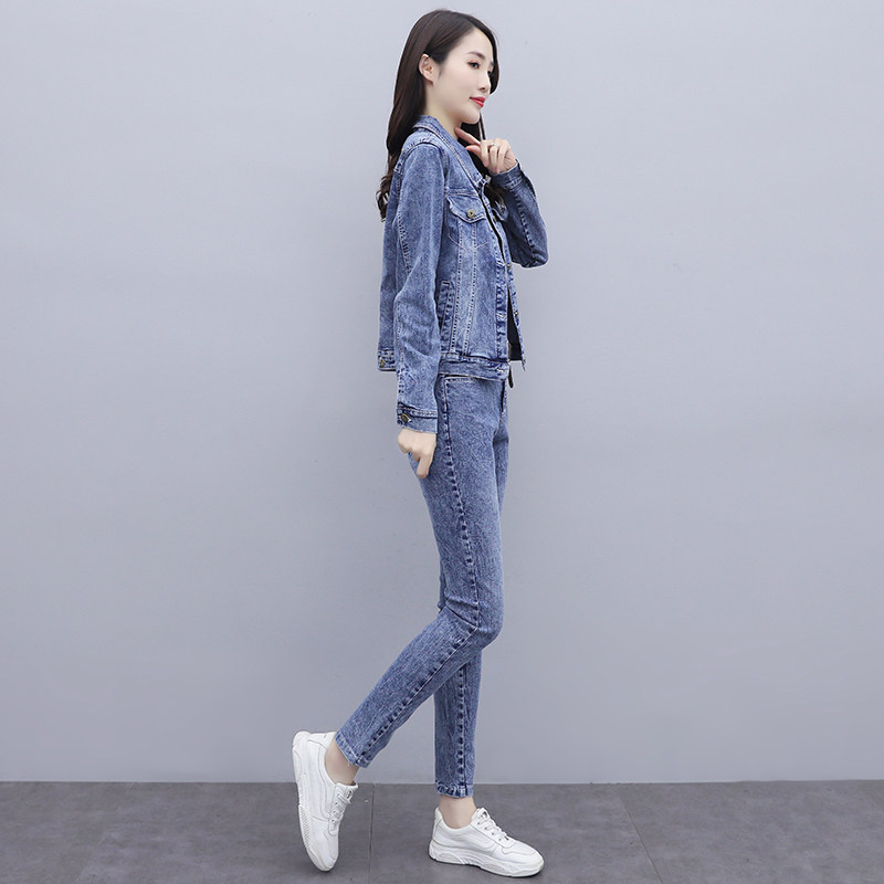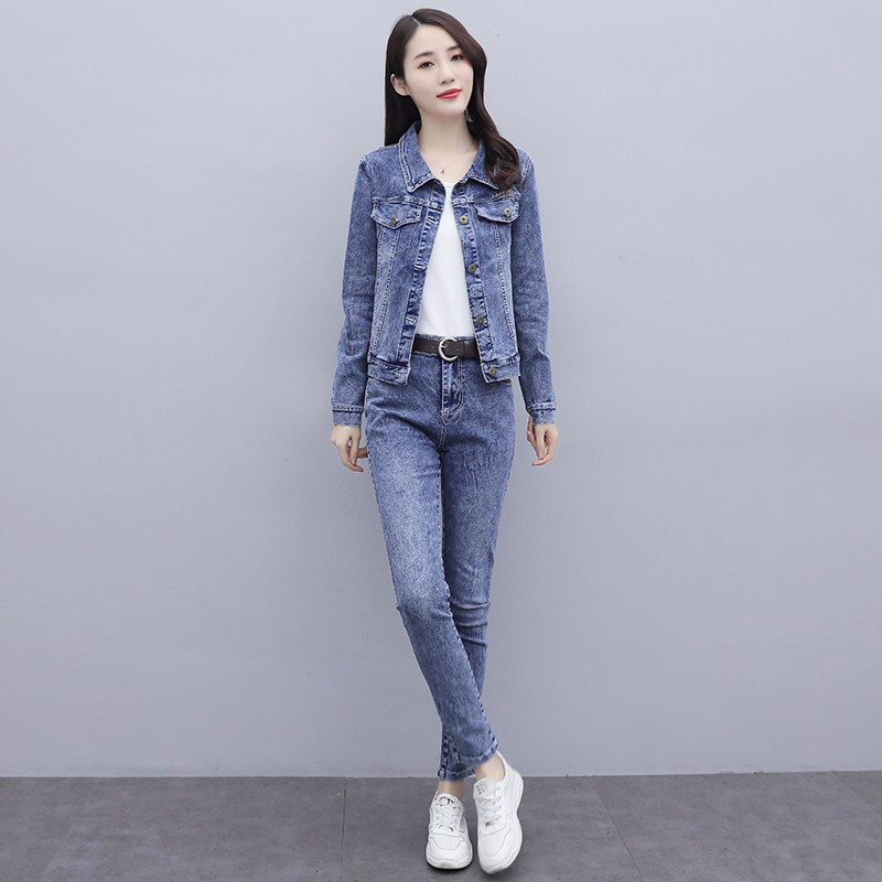 Синий приталенный джинсовый комплект, 2023, осенний, в корейском стиле