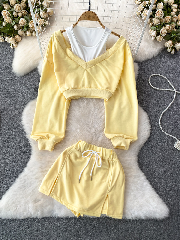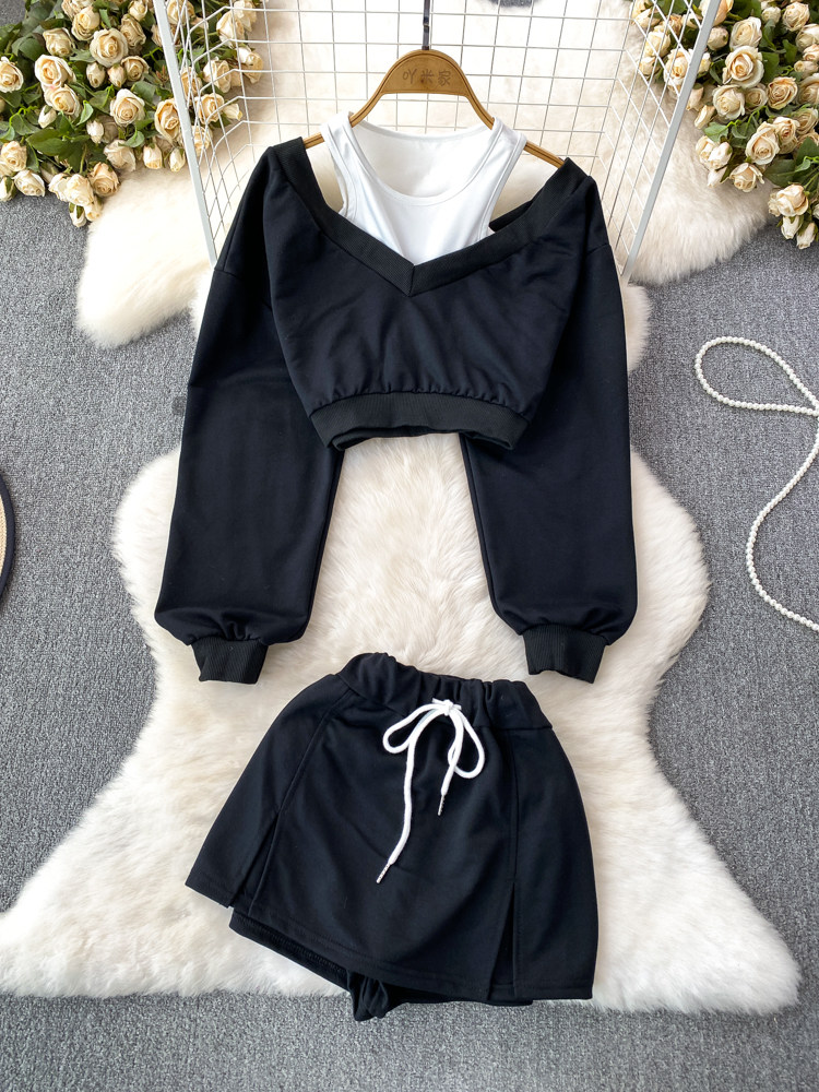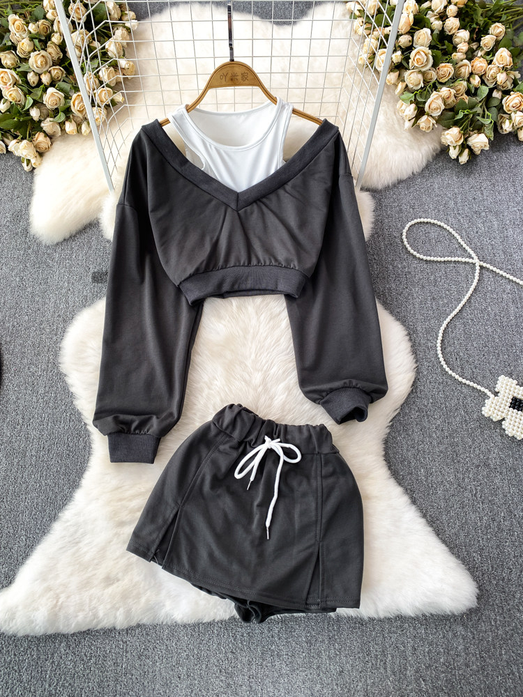 Комплект, короткая спортивная толстовка, шорты, в корейском стиле, высокая талия