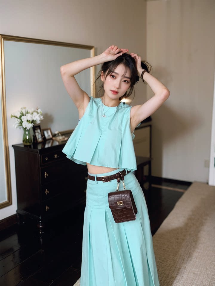 Зеленый летний комплект, дизайнерский жилет без рукавов, юбка, французский стиль, простой и элегантный дизайн, тренд сезона