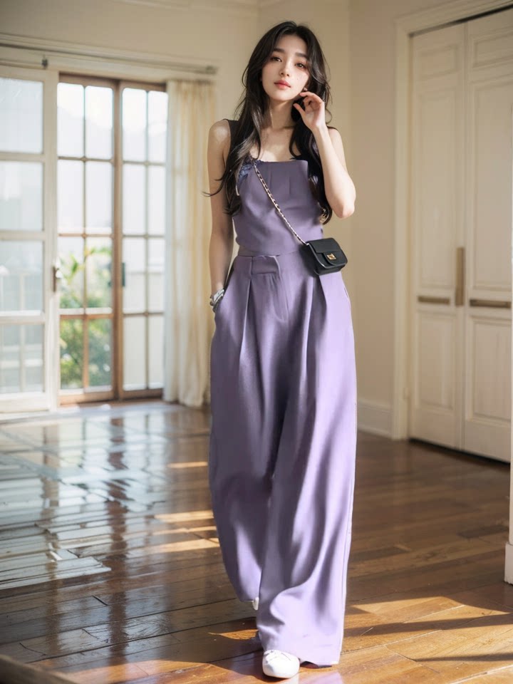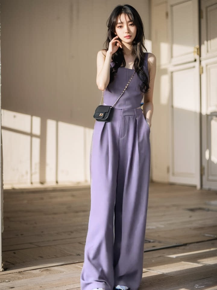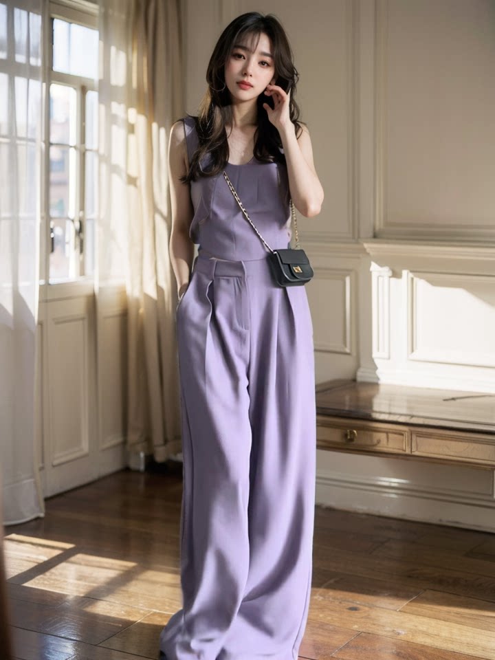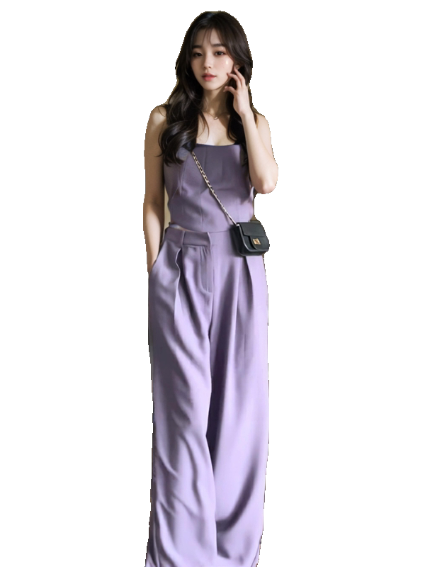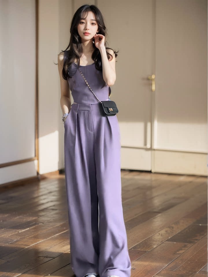 Весенний летний сиреневый топ с чашечками, комплект, 2024 года, в корейском стиле, эластичная талия, свободный крой