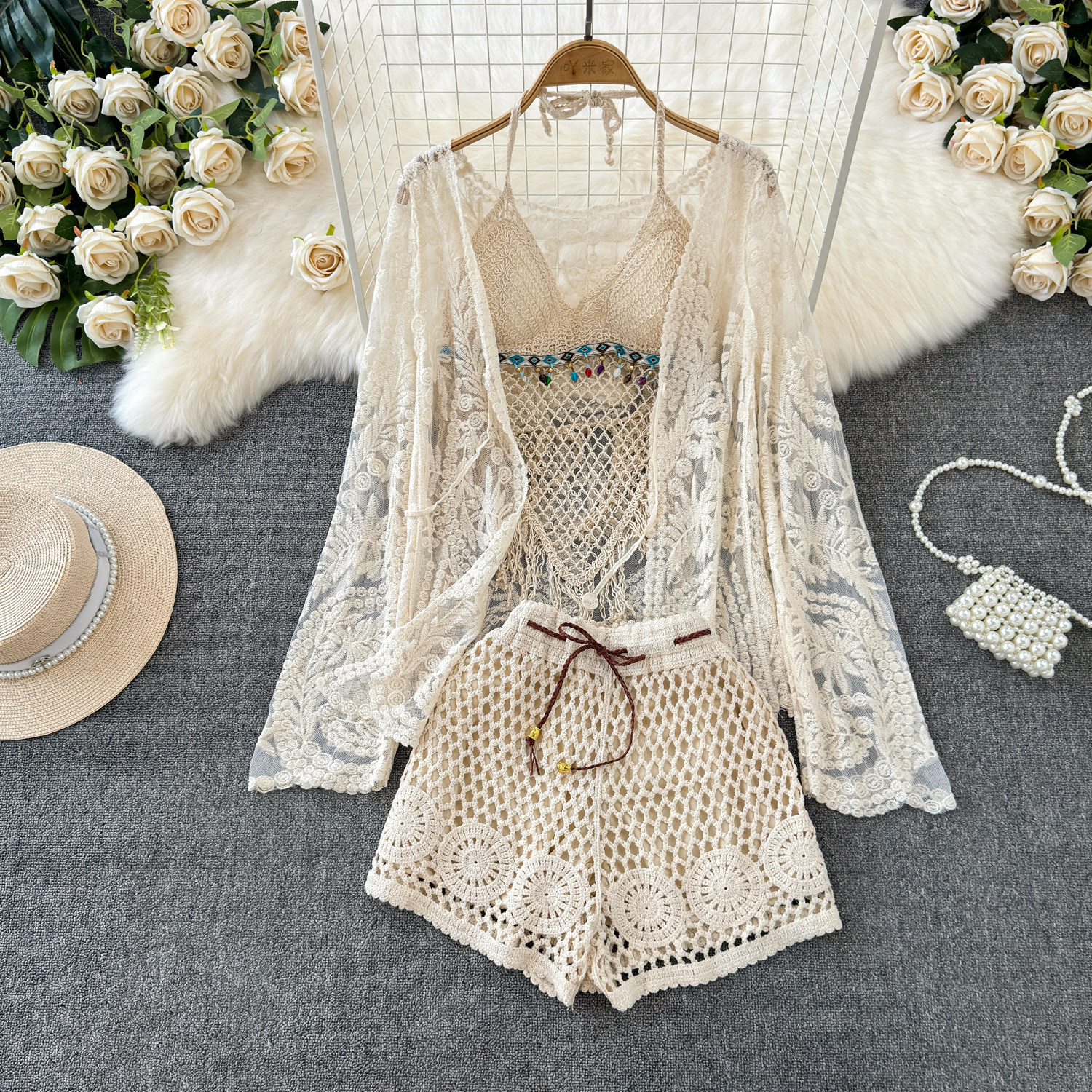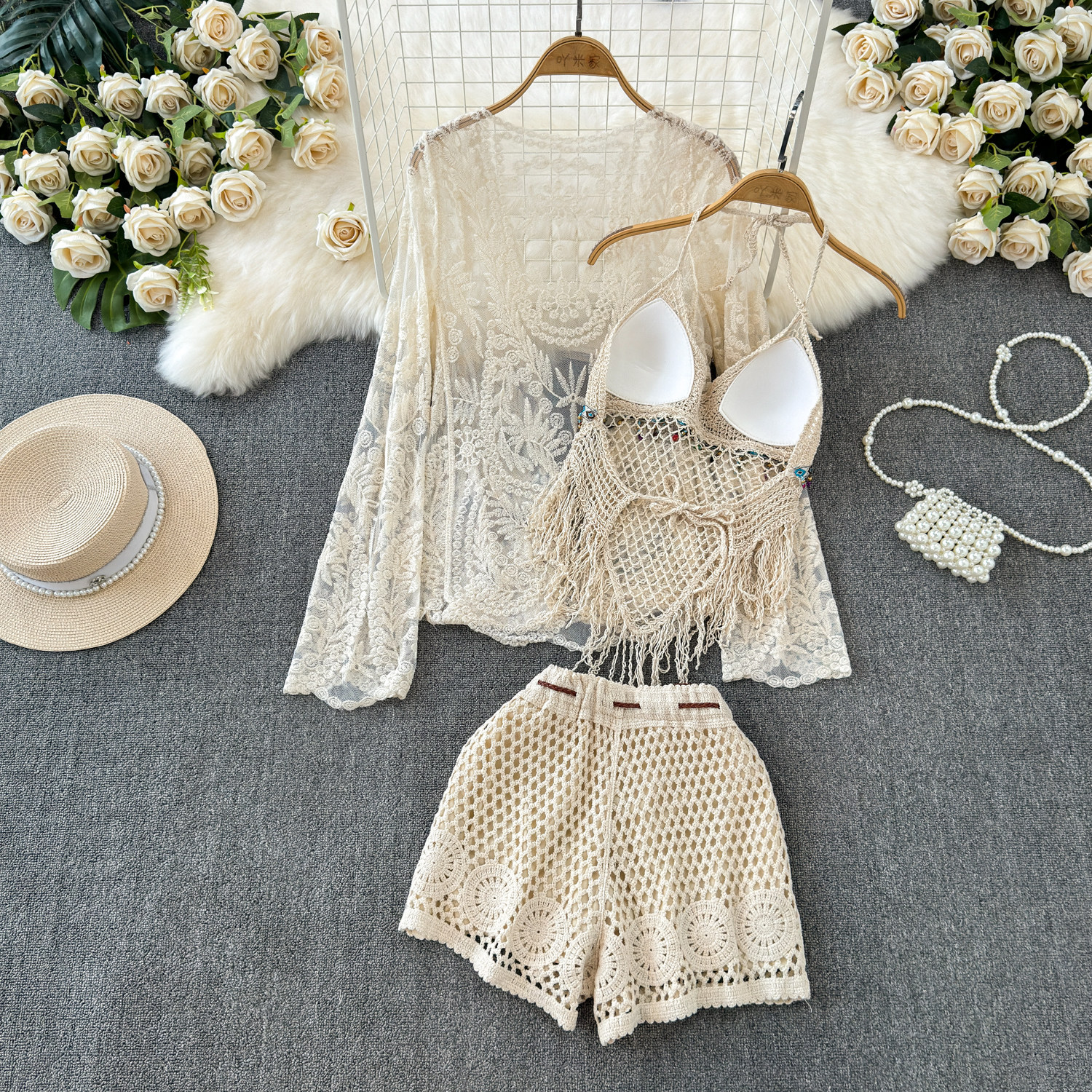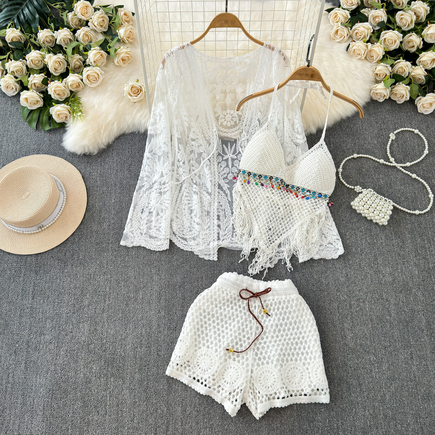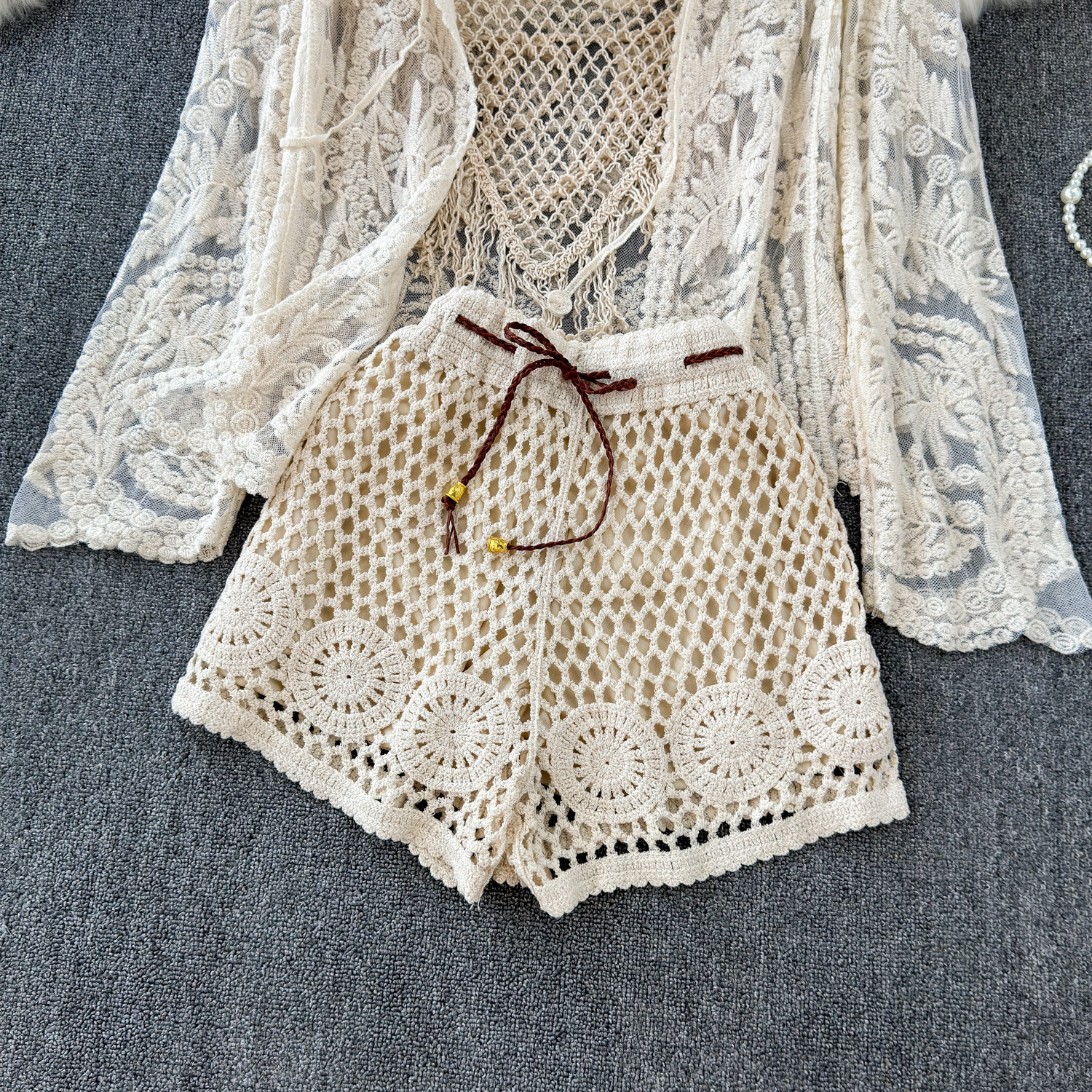 Летний кружевной комплект, кардиган с кисточками, шорты, с вышивкой, 3 предмета