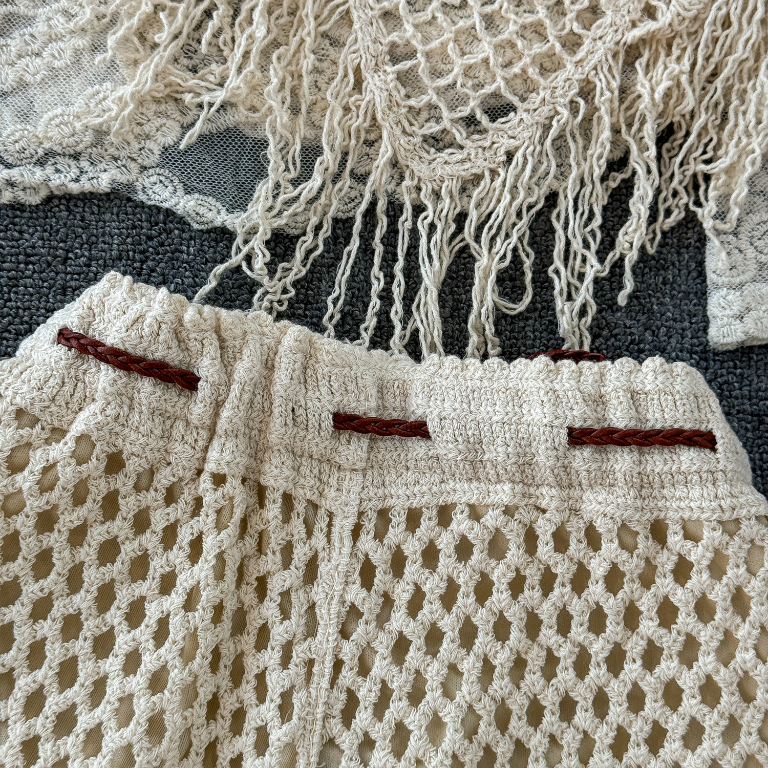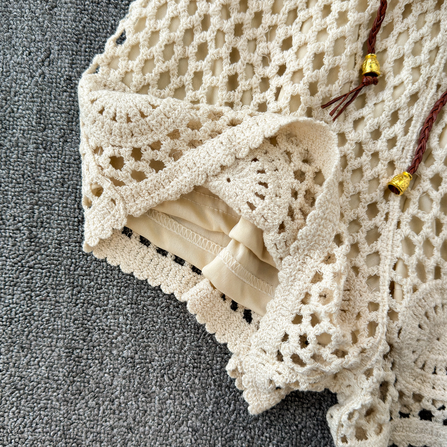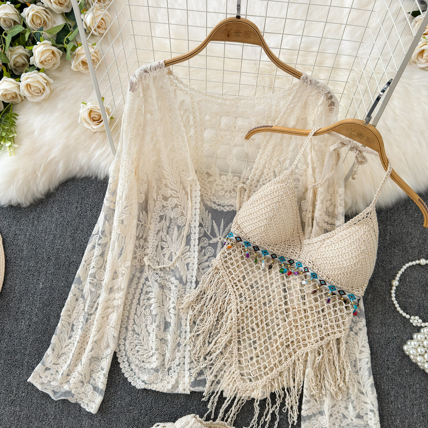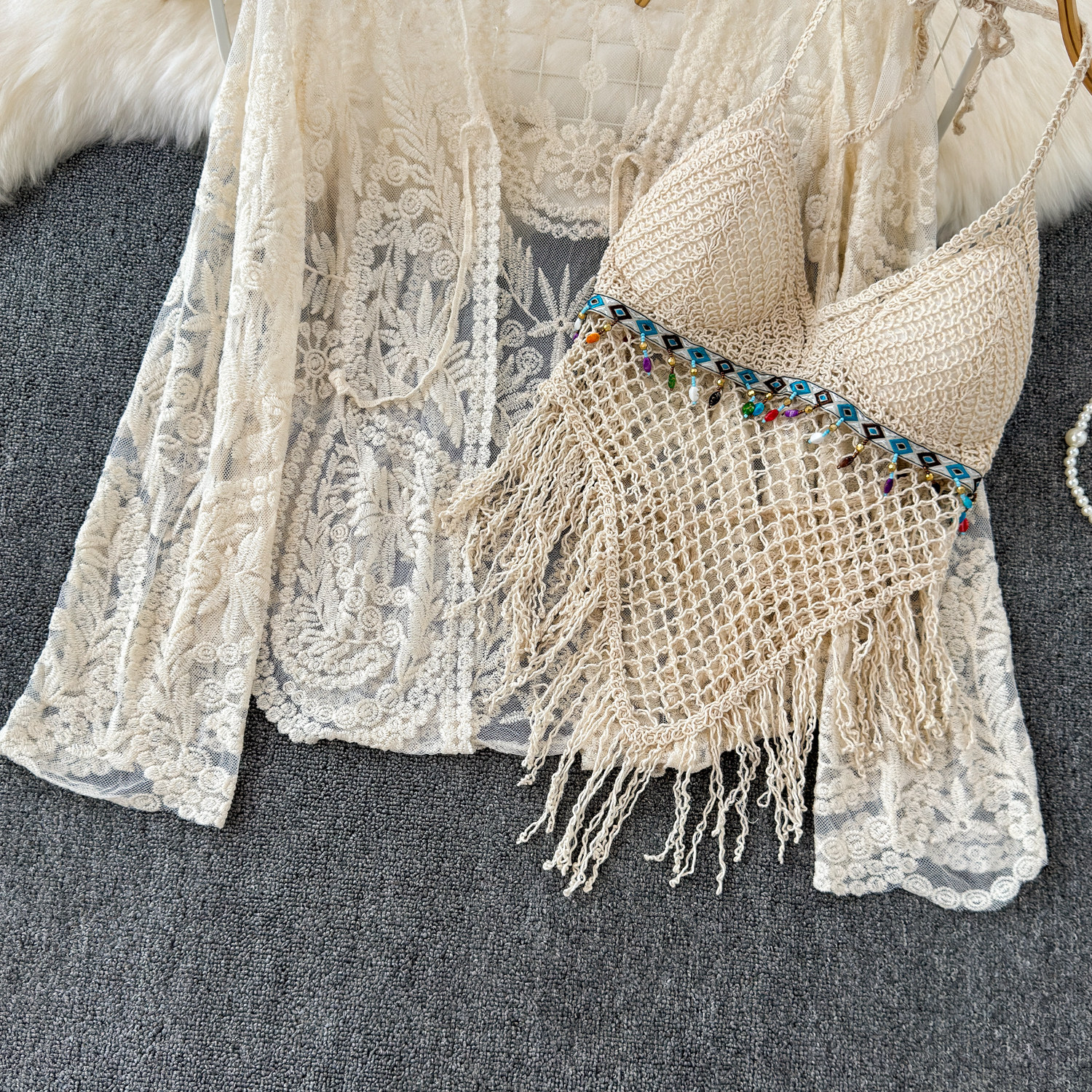 Летний кружевной комплект, кардиган с кисточками, шорты, с вышивкой, 3 предмета