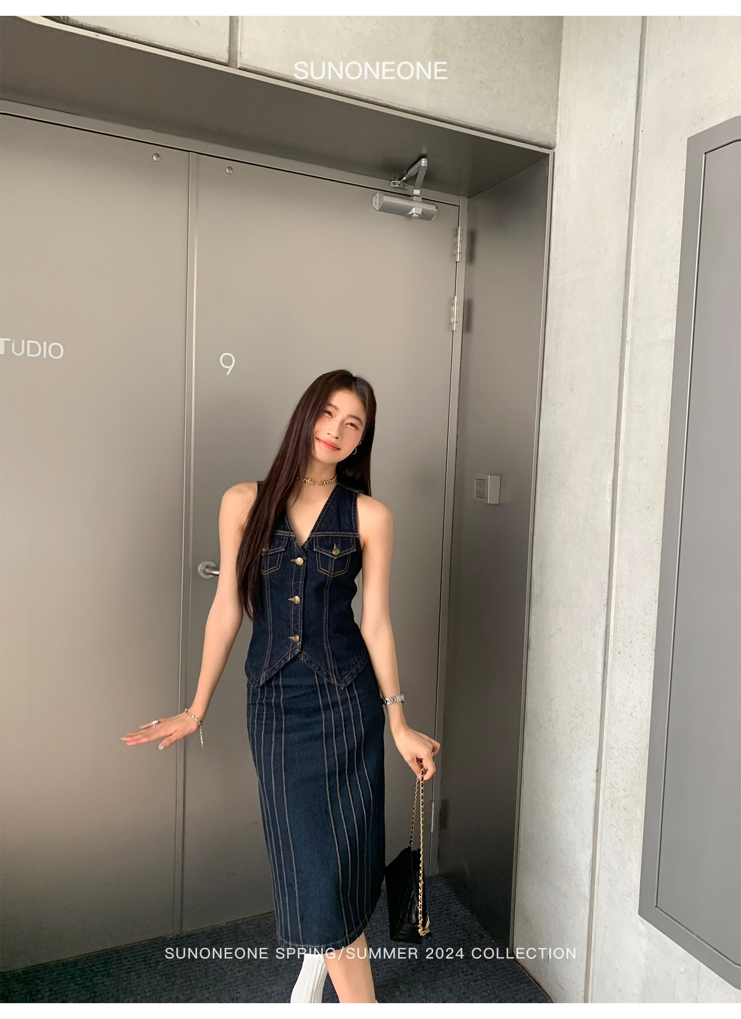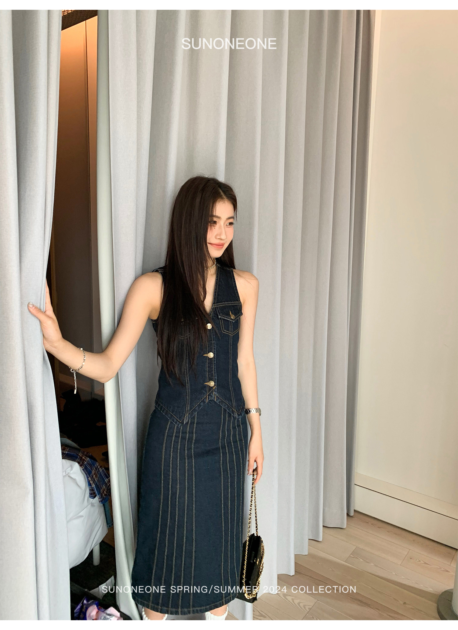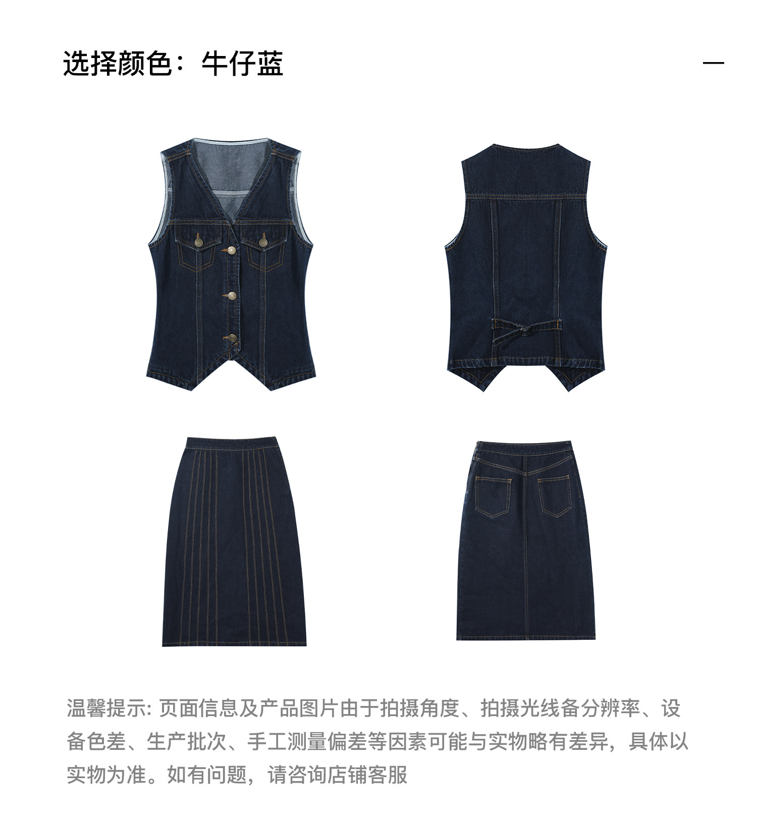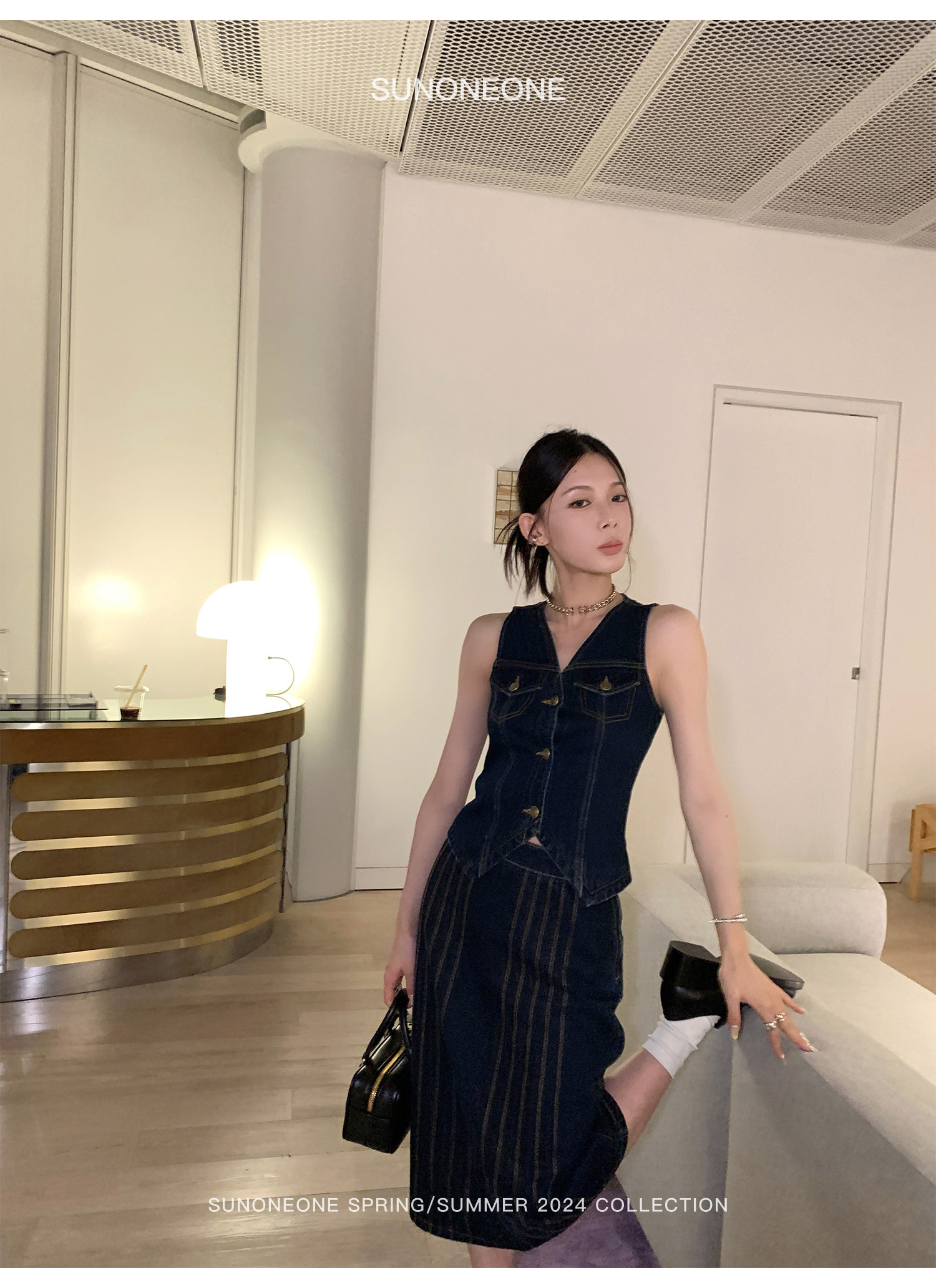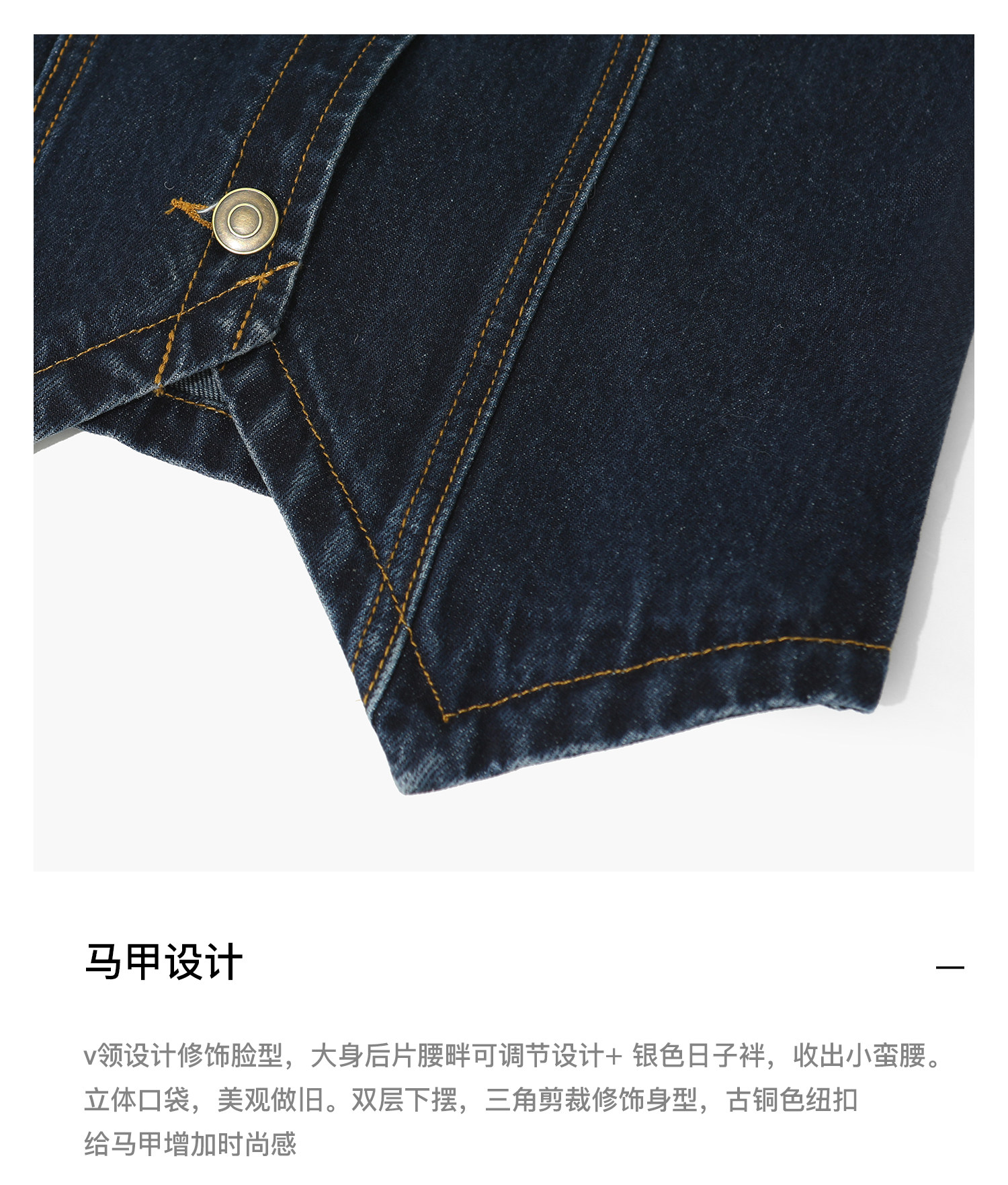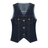 SUNONEONE Джинсовый ретро комплект, жилет, юбка, в американском стиле, V-образный вырез, облегающий крой