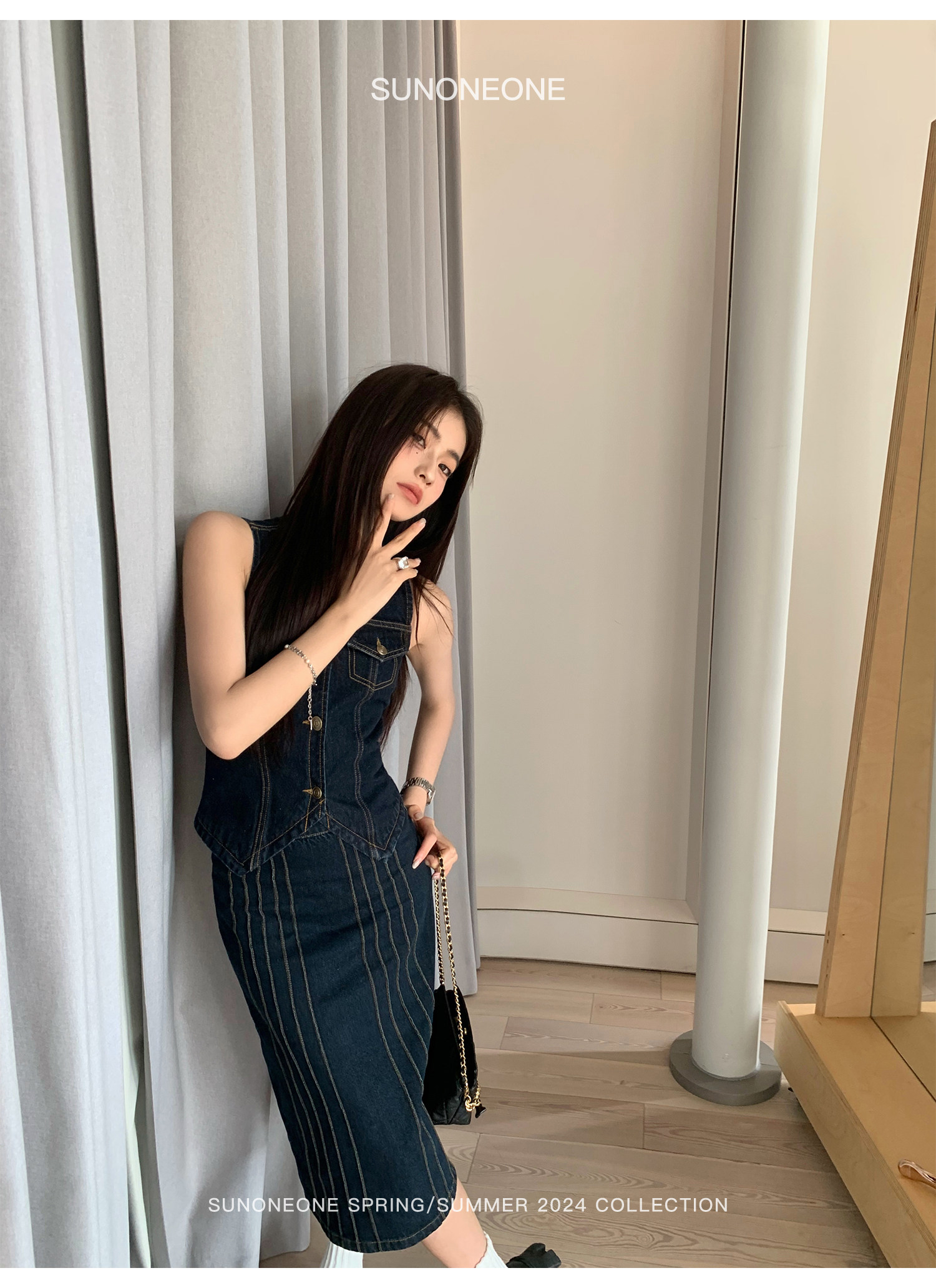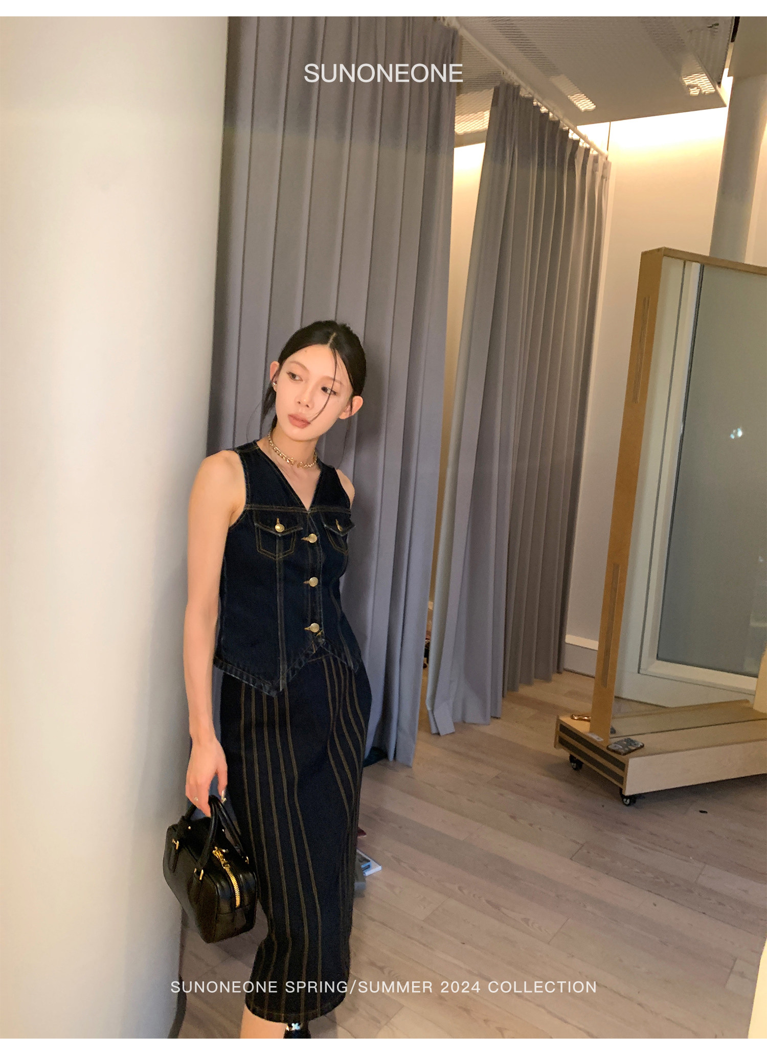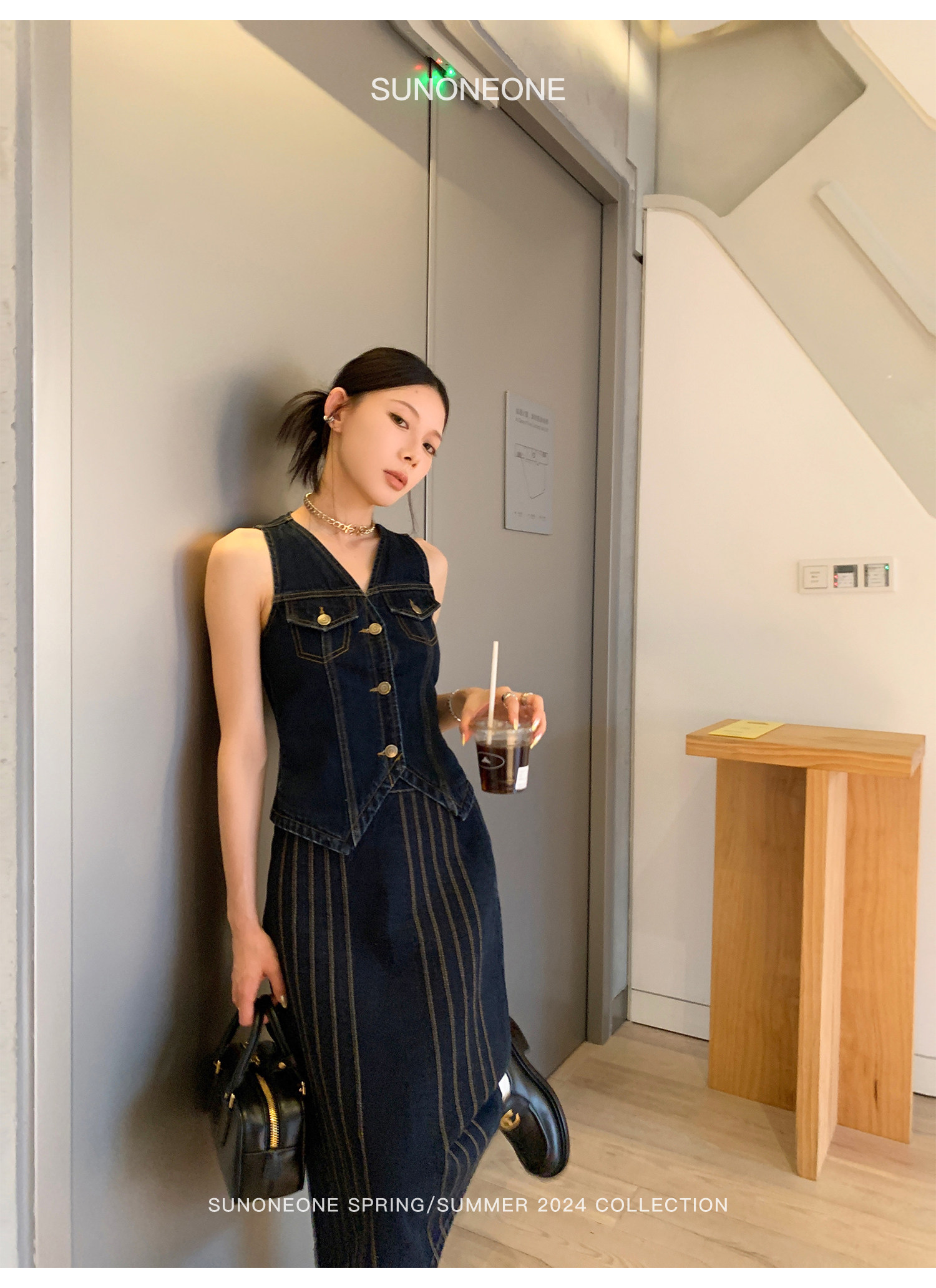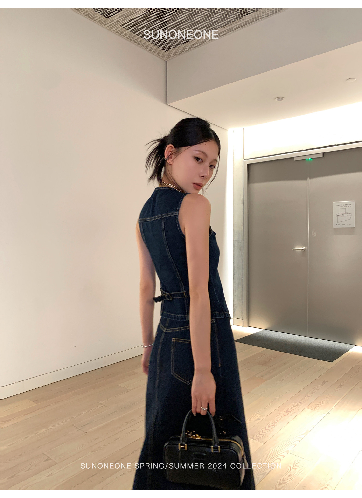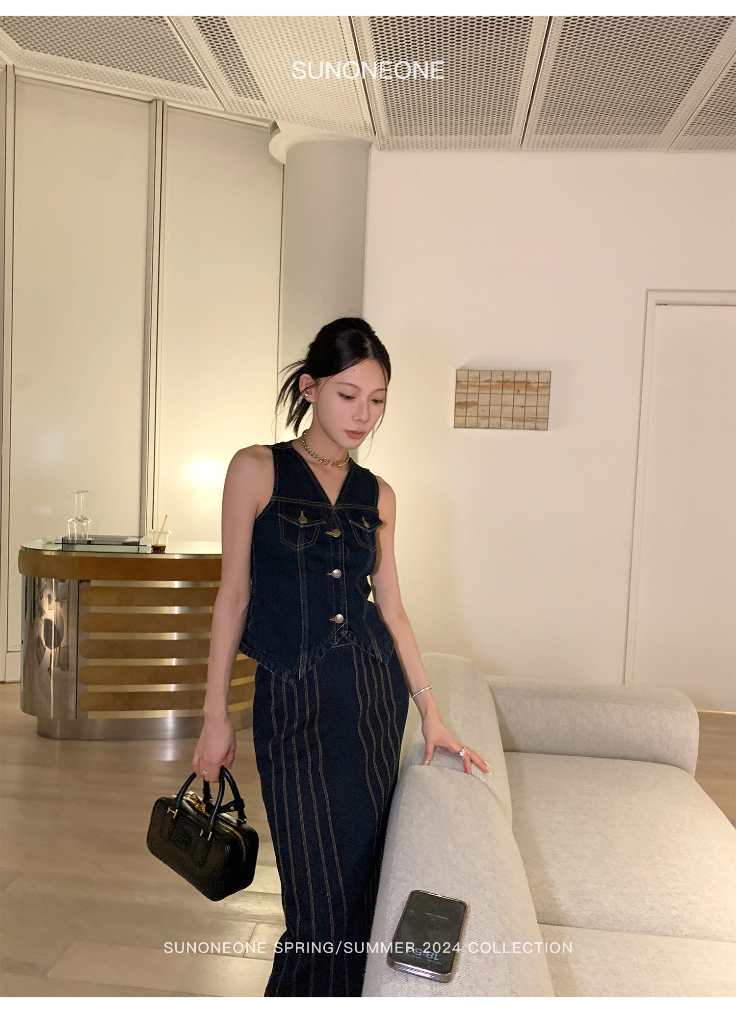 SUNONEONE Джинсовый ретро комплект, жилет, юбка, в американском стиле, V-образный вырез, облегающий крой