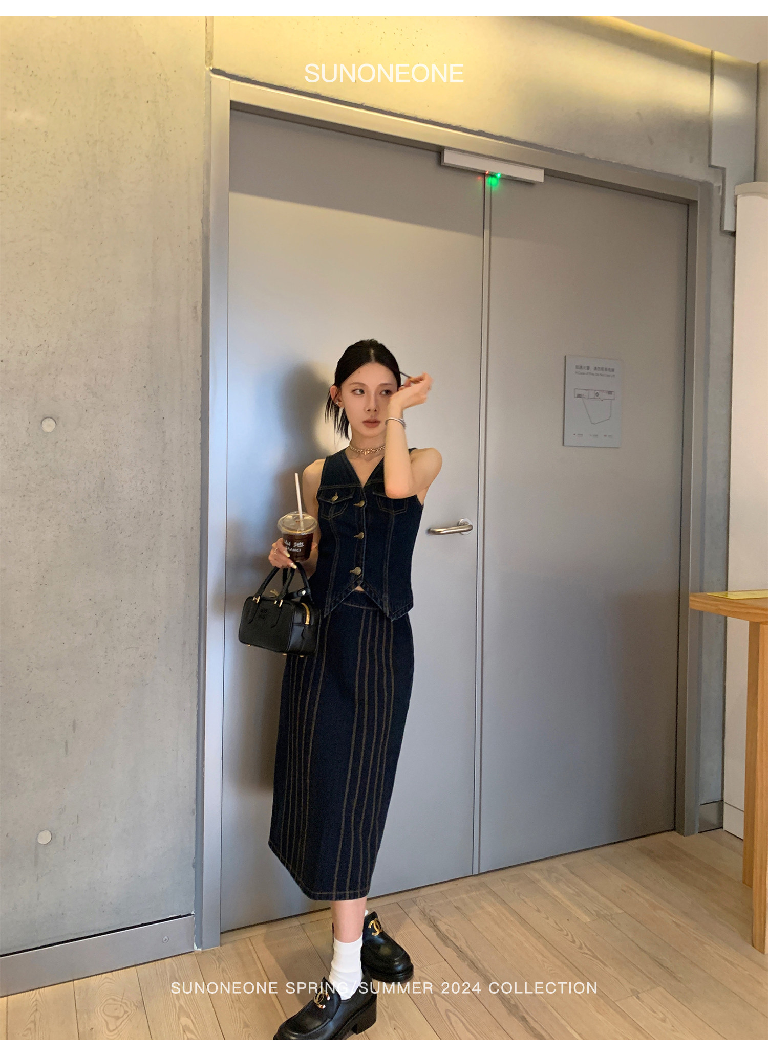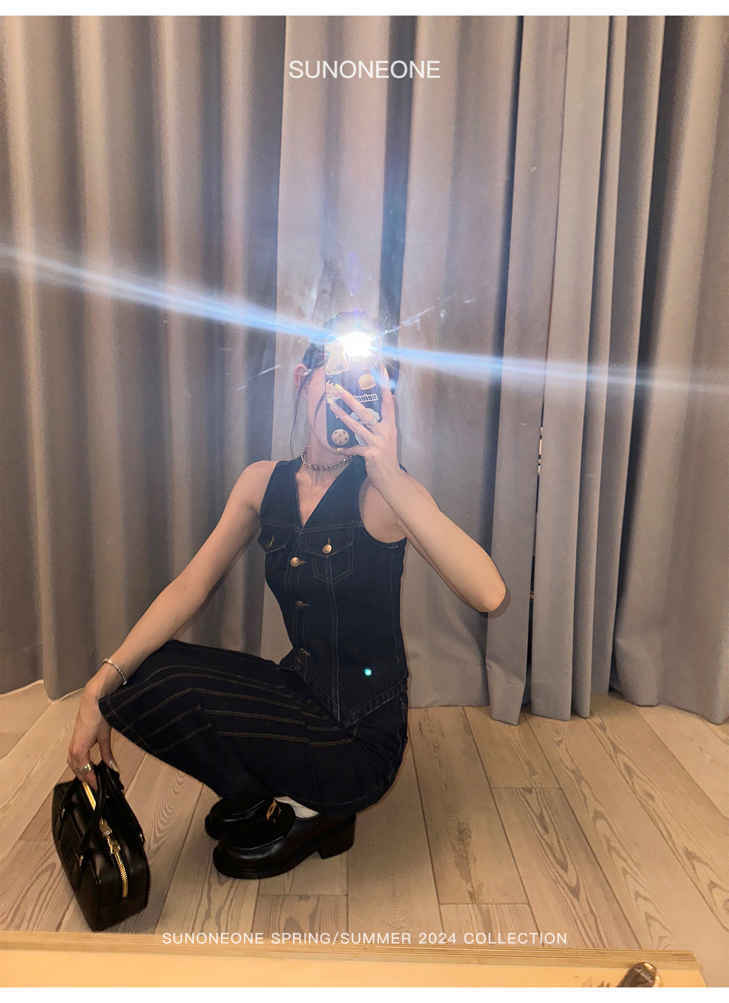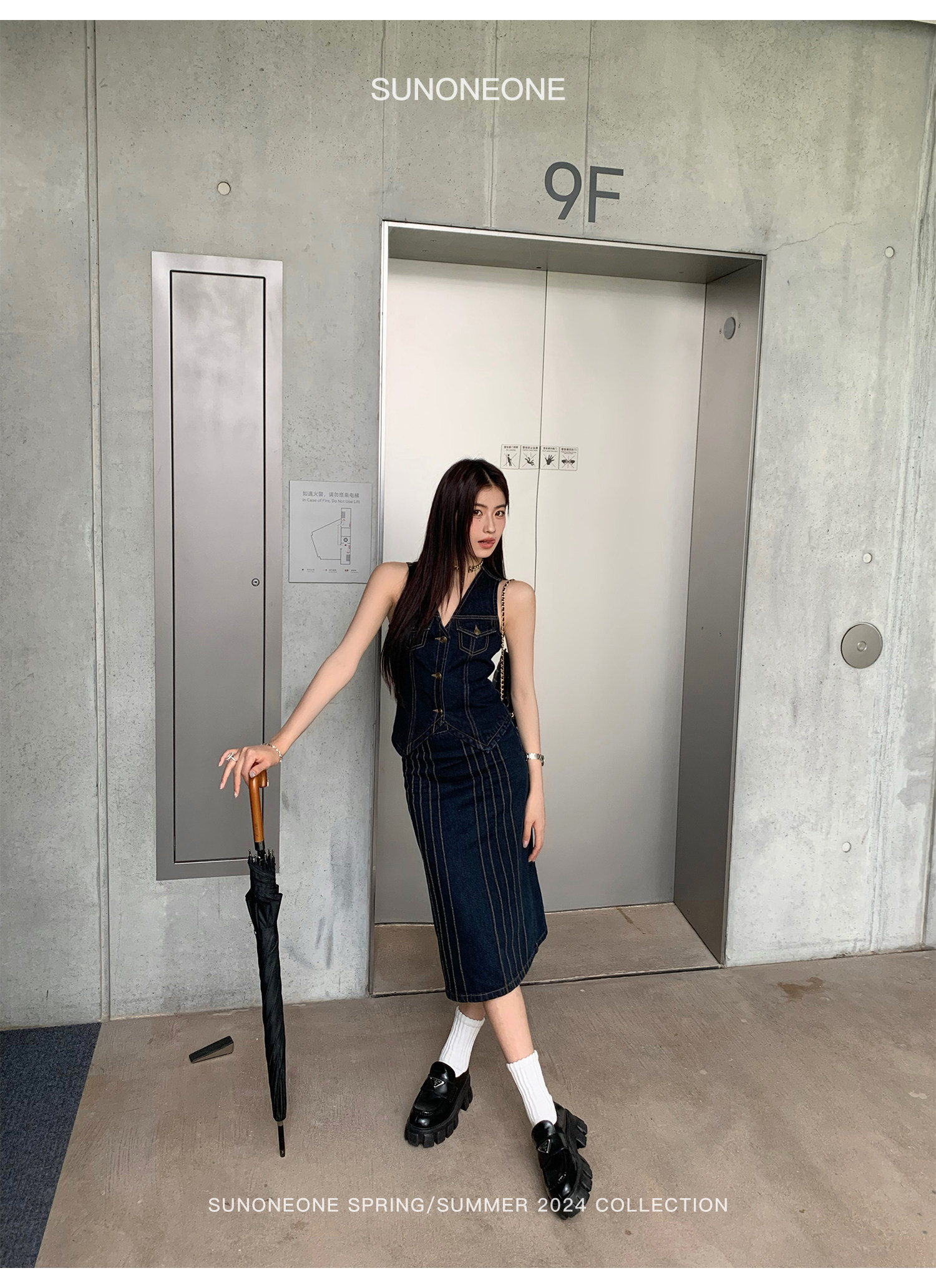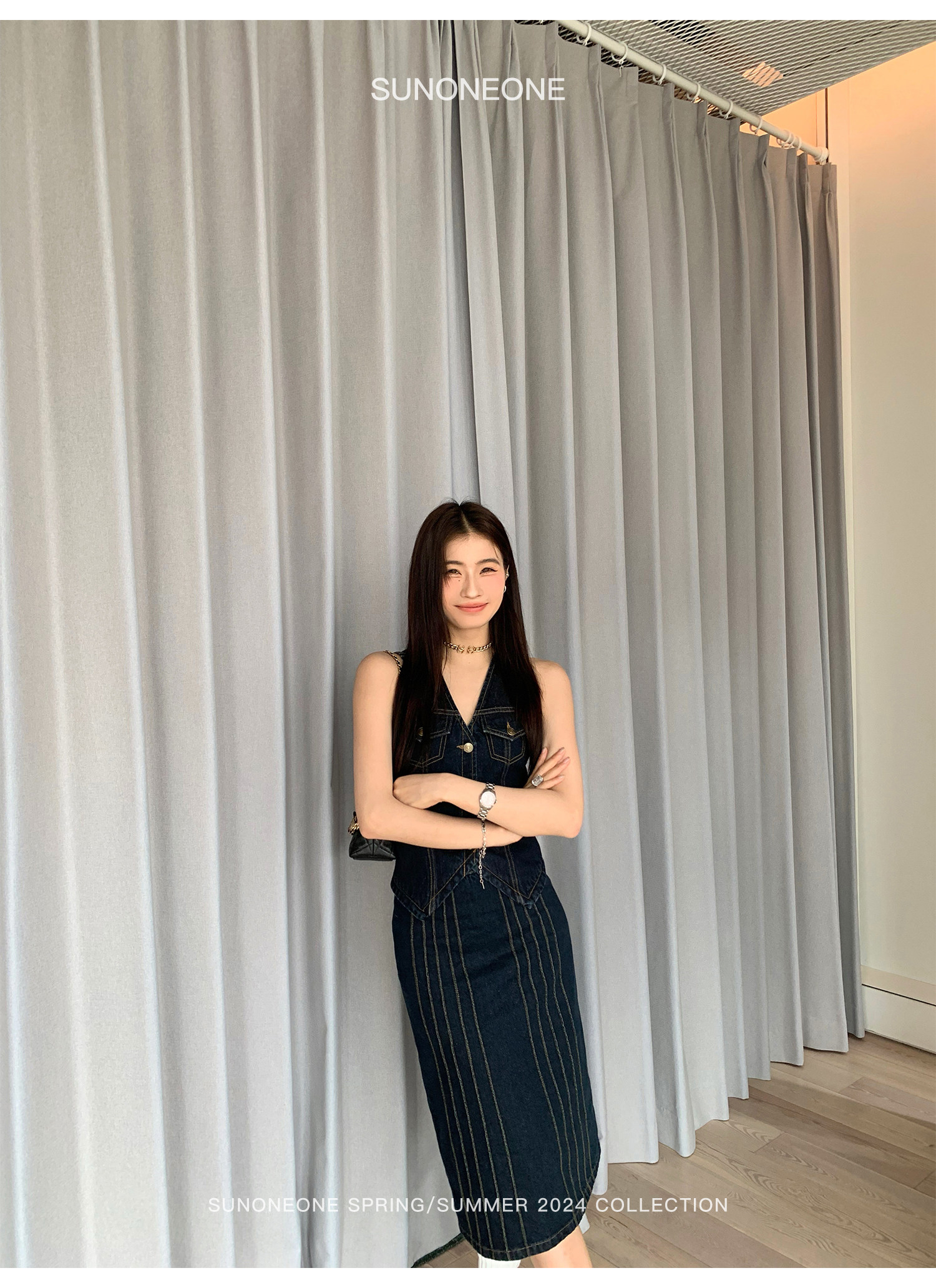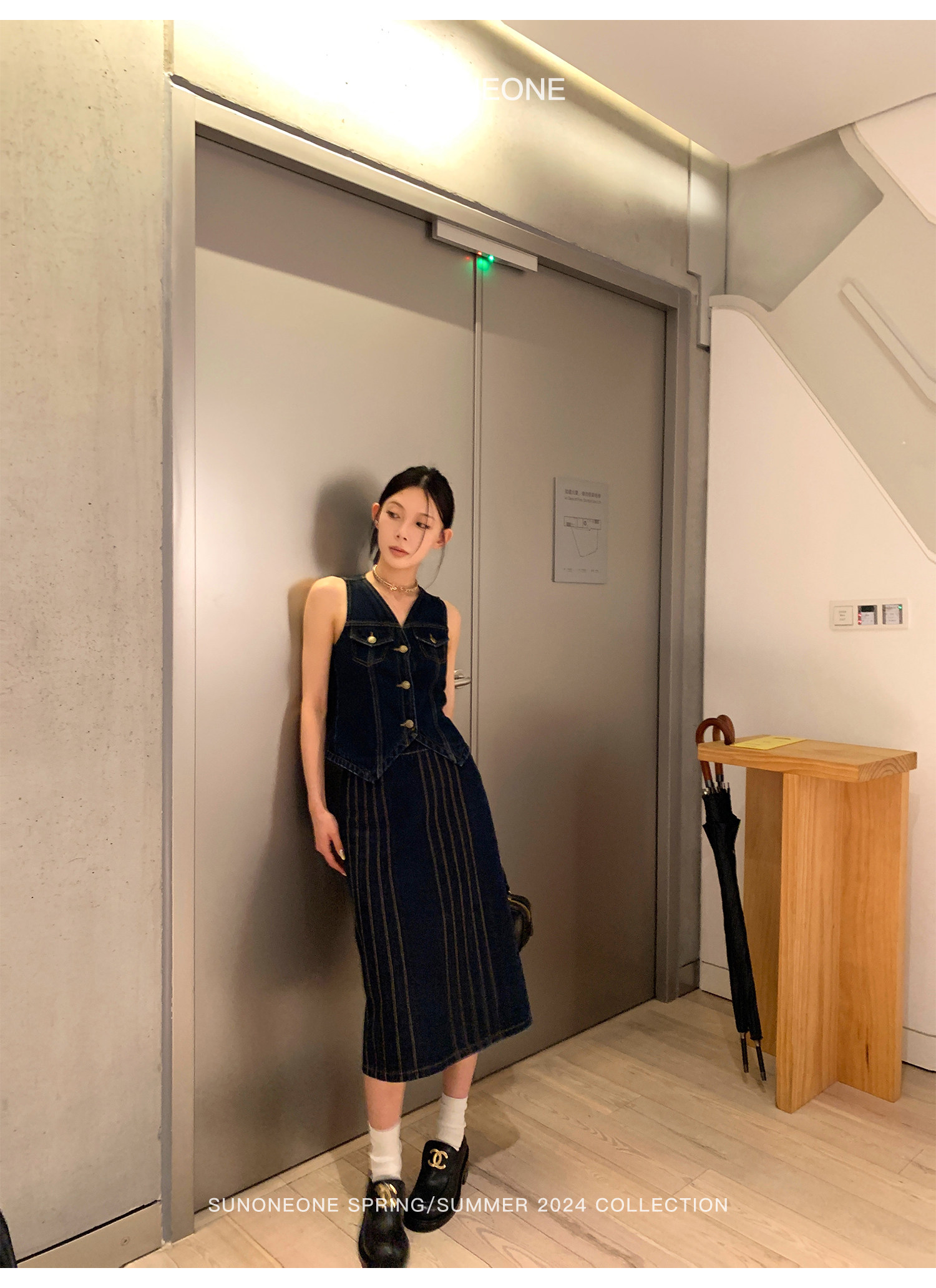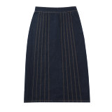 SUNONEONE Джинсовый ретро комплект, жилет, юбка, в американском стиле, V-образный вырез, облегающий крой
