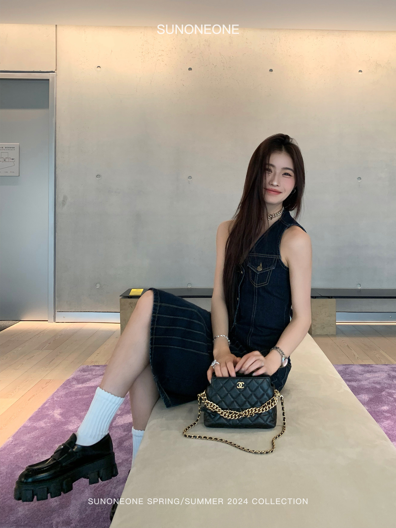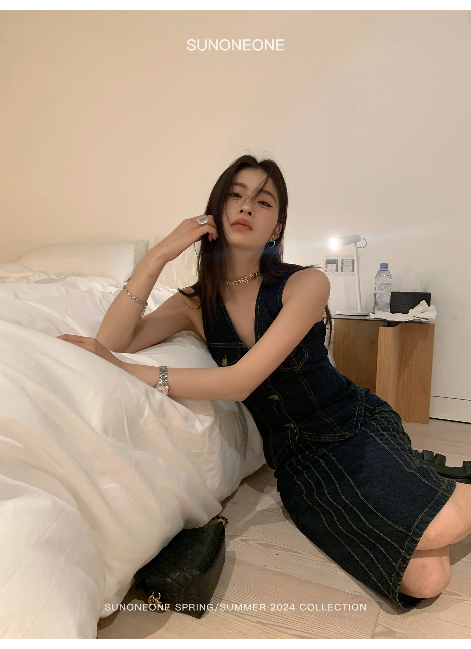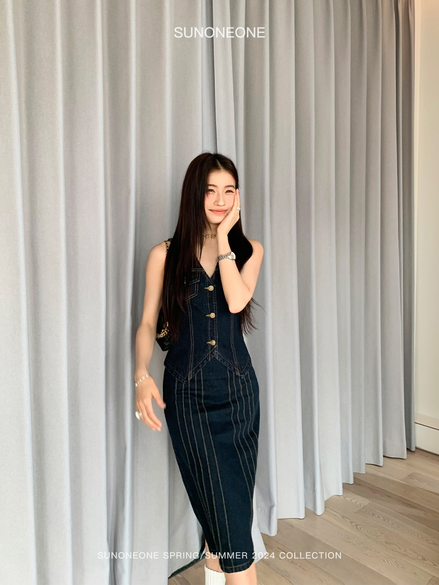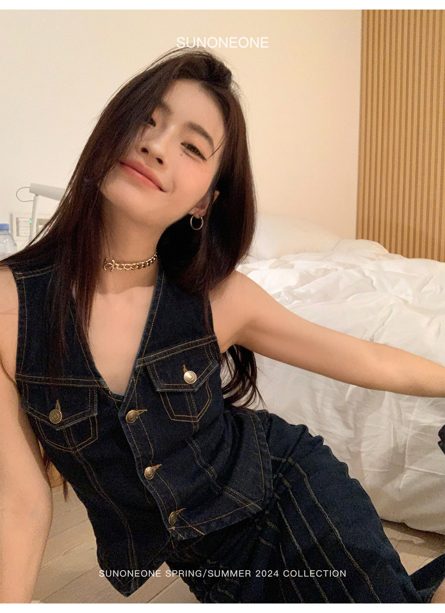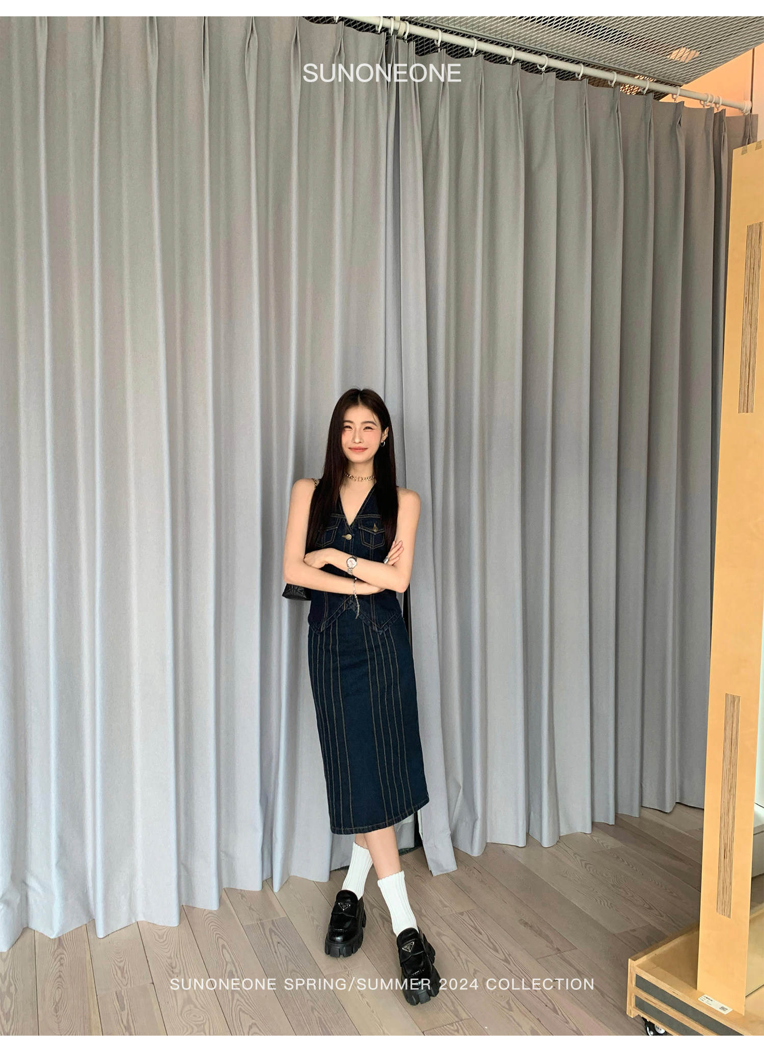 SUNONEONE Джинсовый ретро комплект, жилет, юбка, в американском стиле, V-образный вырез, облегающий крой
