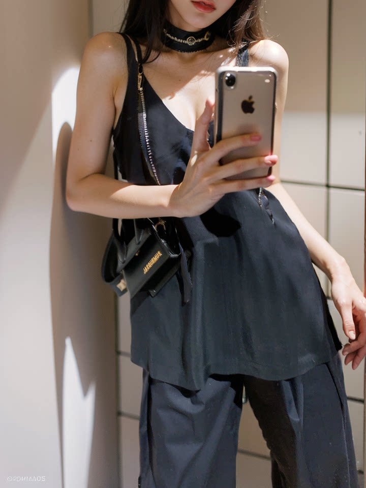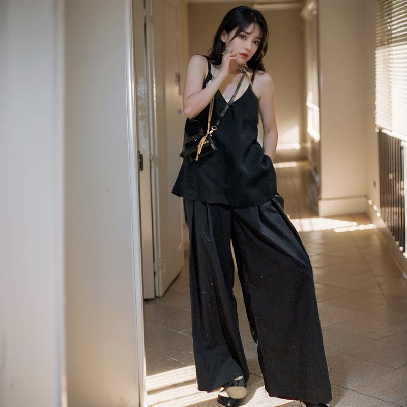 Летняя черная майка топ без рукавов, штаны, комплект, городской стиль, яркий броский стиль, эффект подтяжки, V-образный вырез