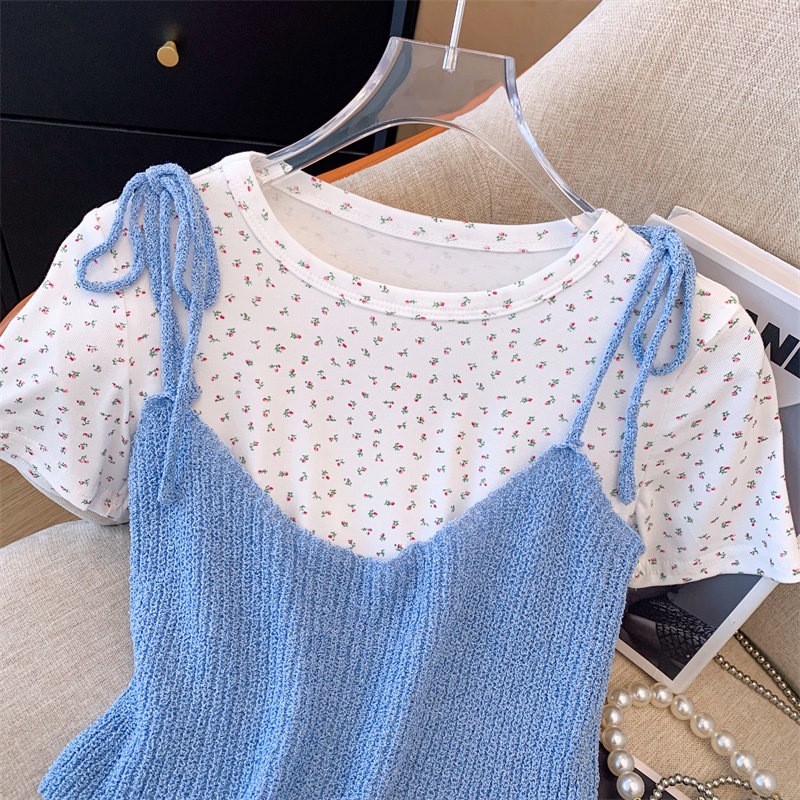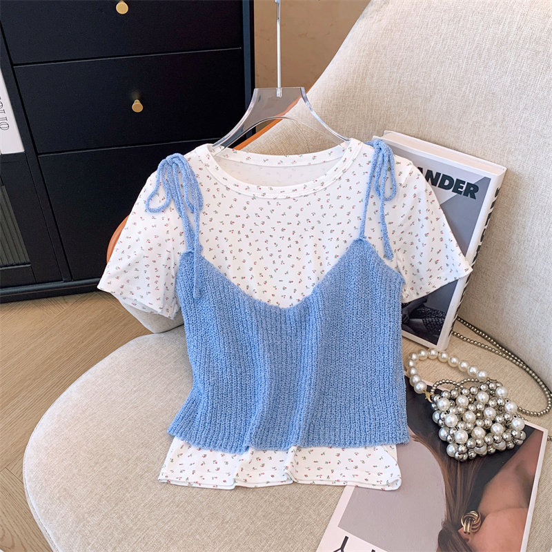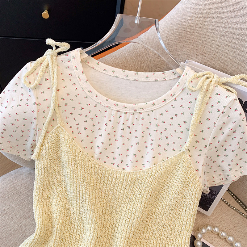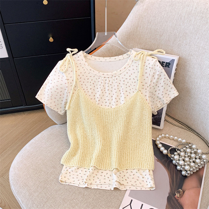 Милый короткий летний комплект, трикотажная футболка, цветочный принт, эффект подтяжки