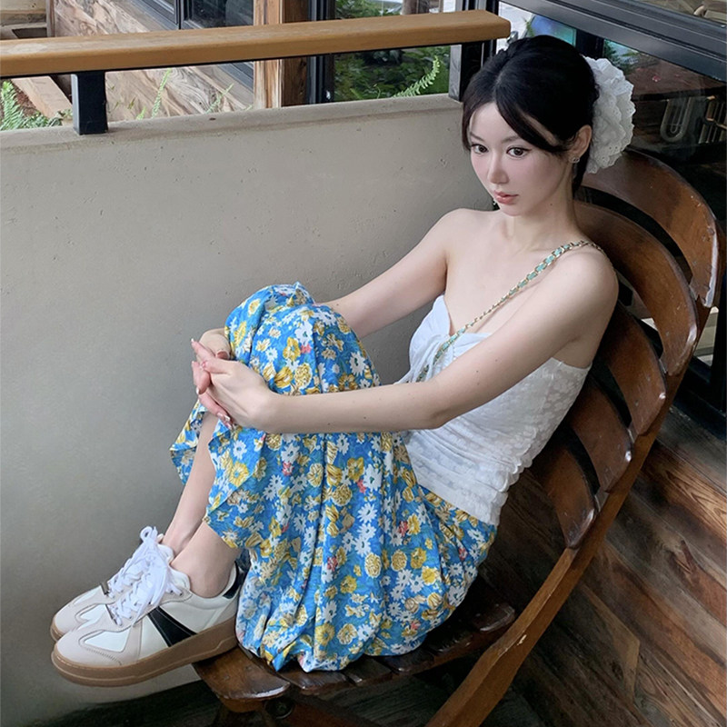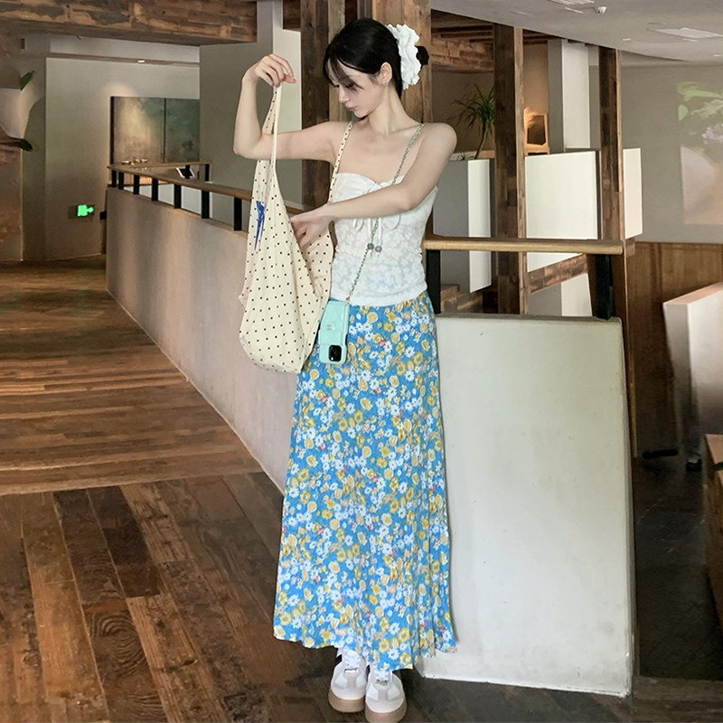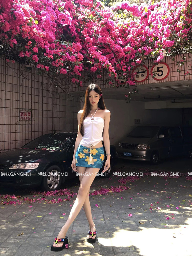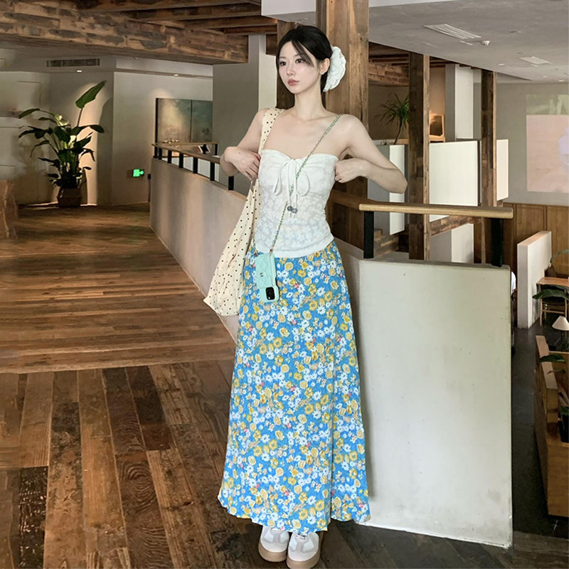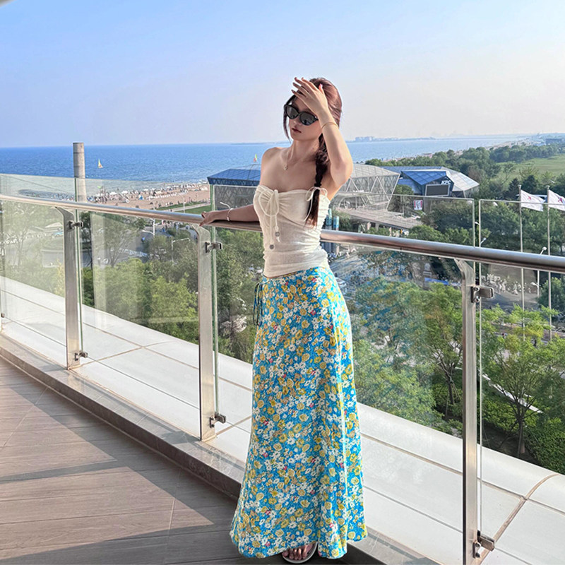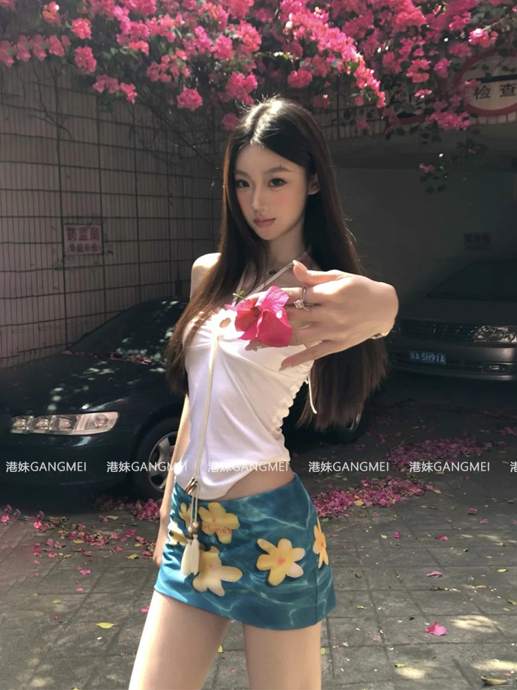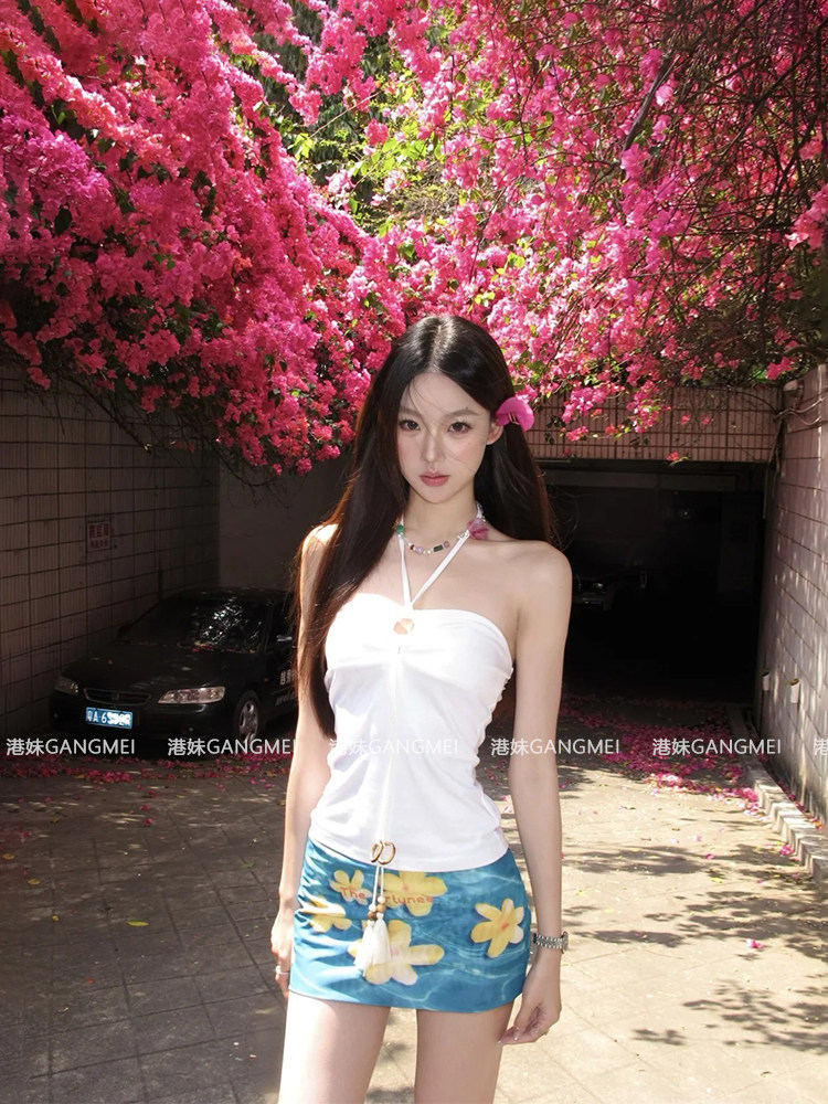 Дизайнерский комплект, белый синий бюстгальтер-топ, юбка, тренд сезона, цветочный принт