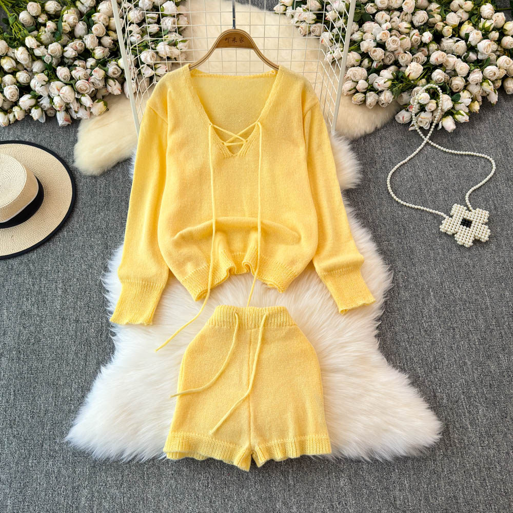Комплект, лонгслив, приталенный свитер, осенние шорты для отдыха, штаны, в корейском стиле, V-образный вырез, высокая талия
