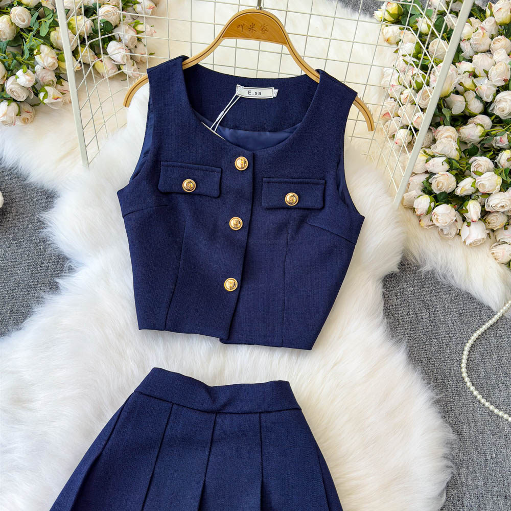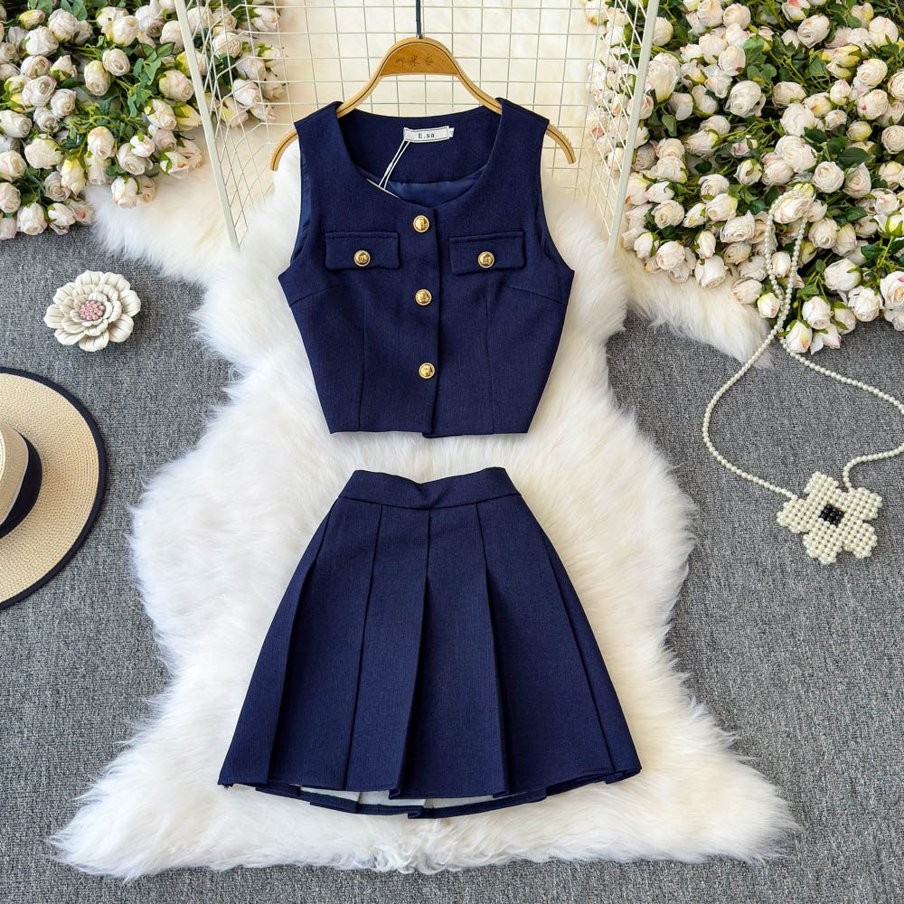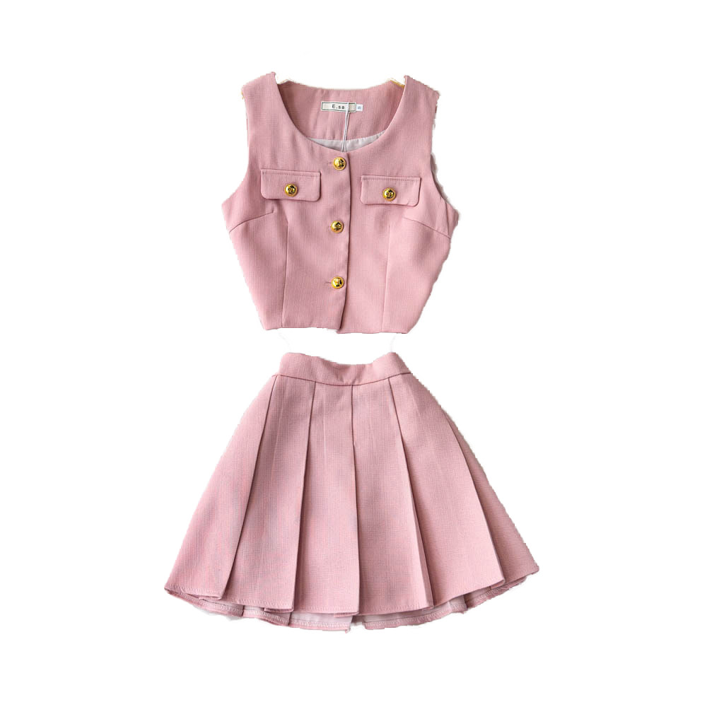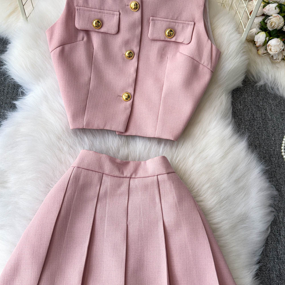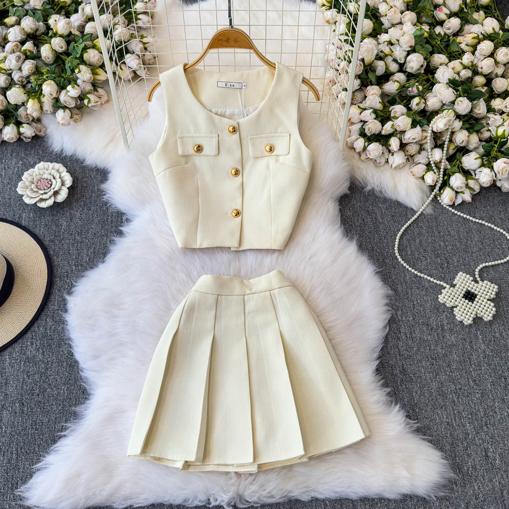 Летний элитный комплект, приталенный жилет с круглым воротником, юбка в складку, в стиле Шанель, высокая талия
