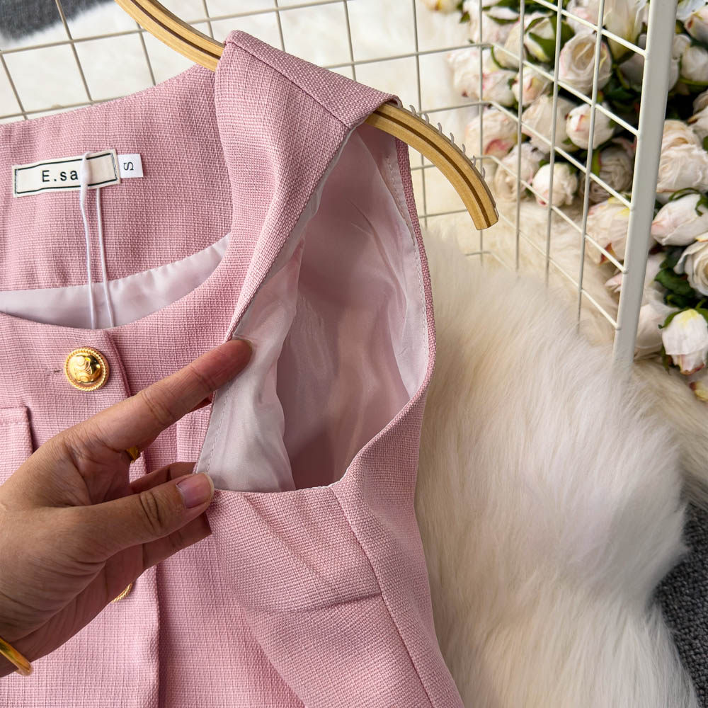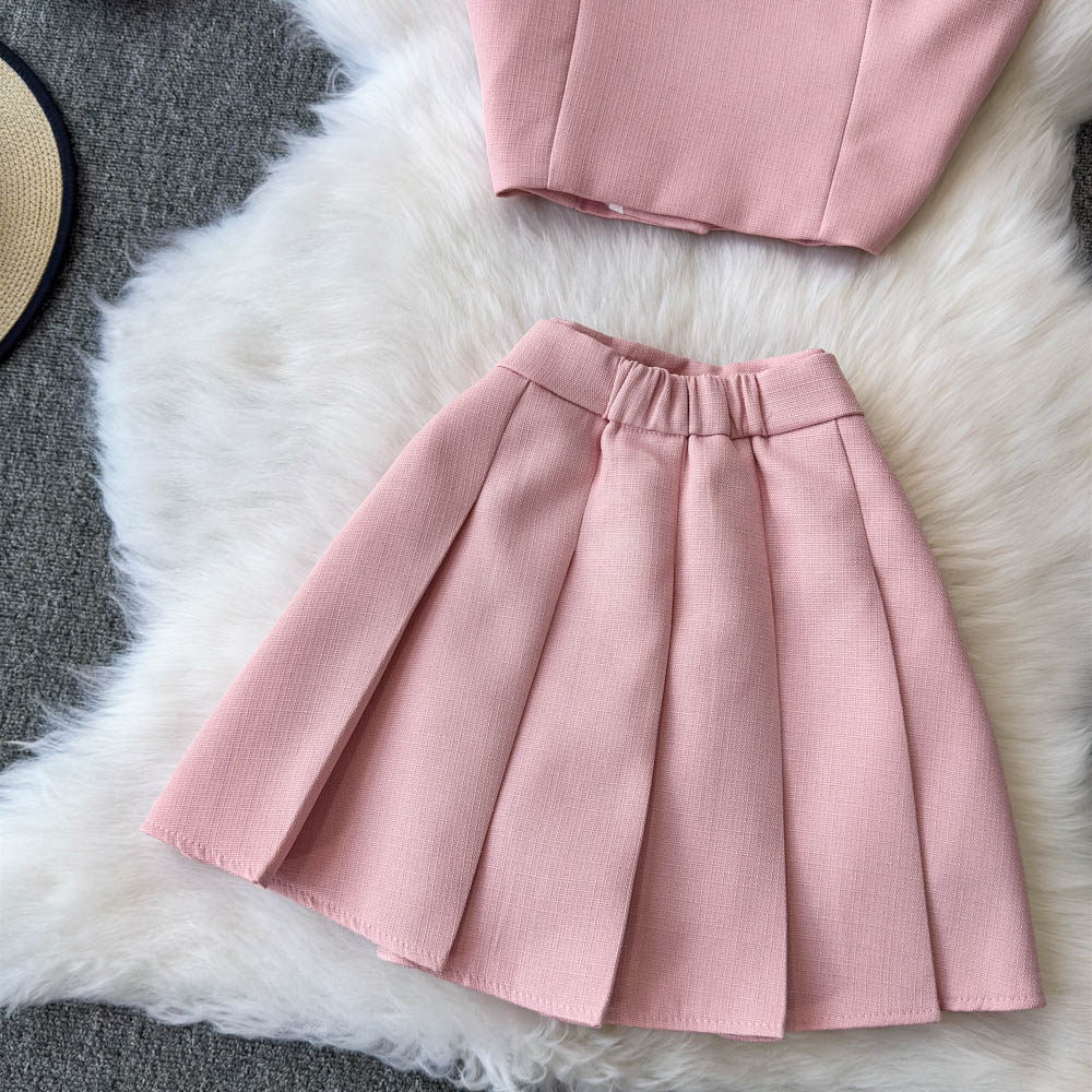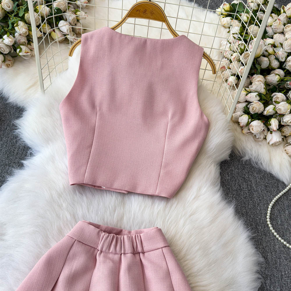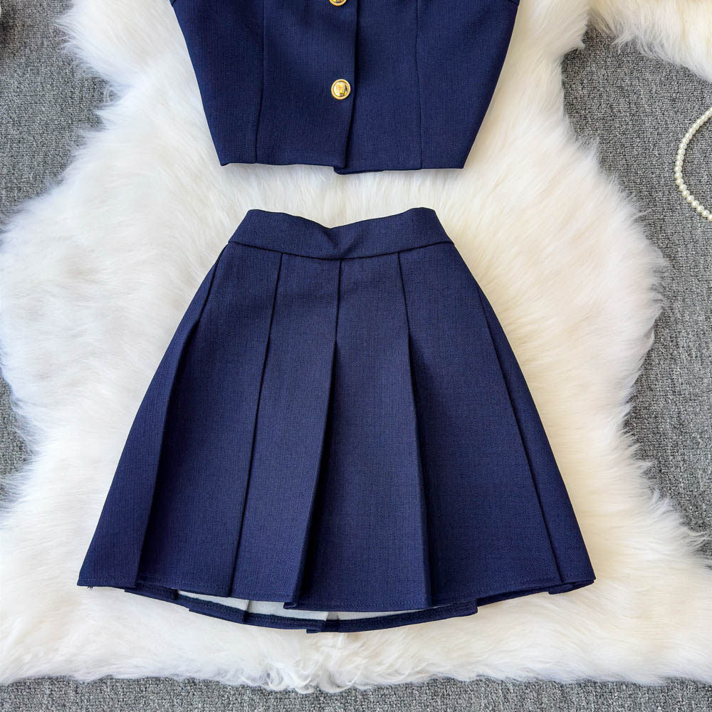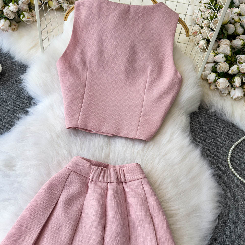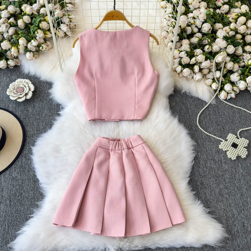 Летний элитный комплект, приталенный жилет с круглым воротником, юбка в складку, в стиле Шанель, высокая талия