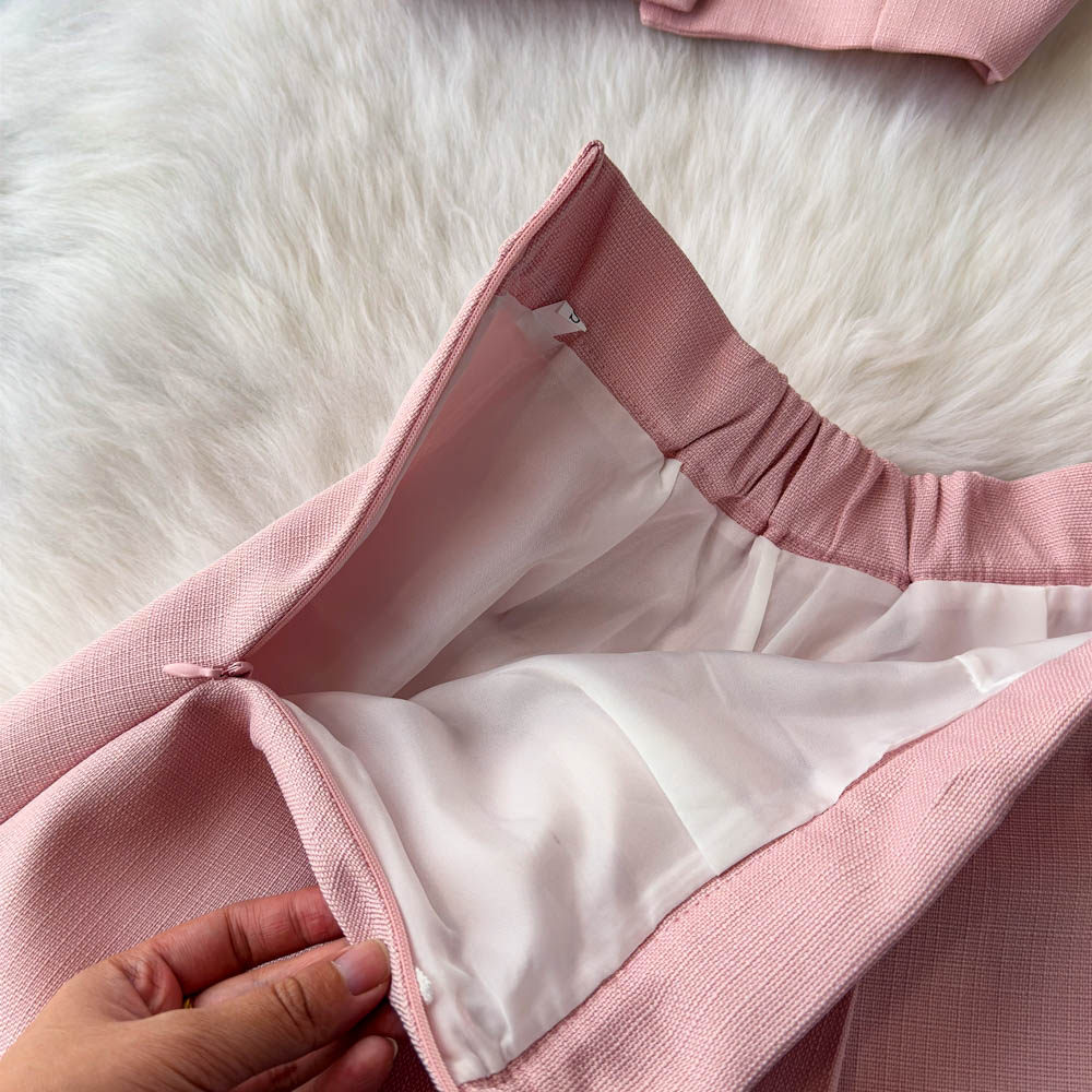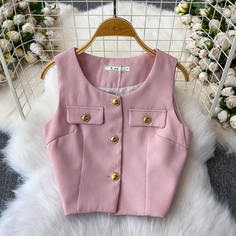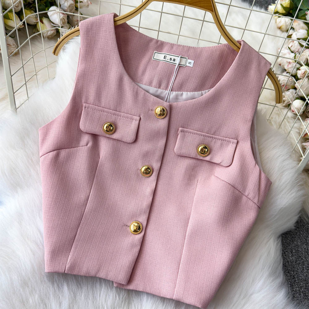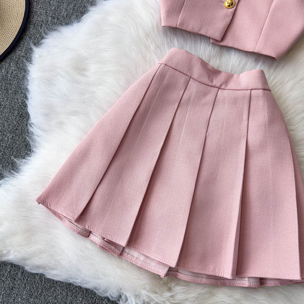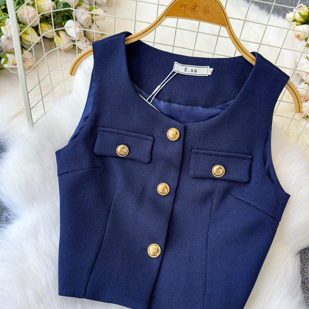 Летний элитный комплект, приталенный жилет с круглым воротником, юбка в складку, в стиле Шанель, высокая талия