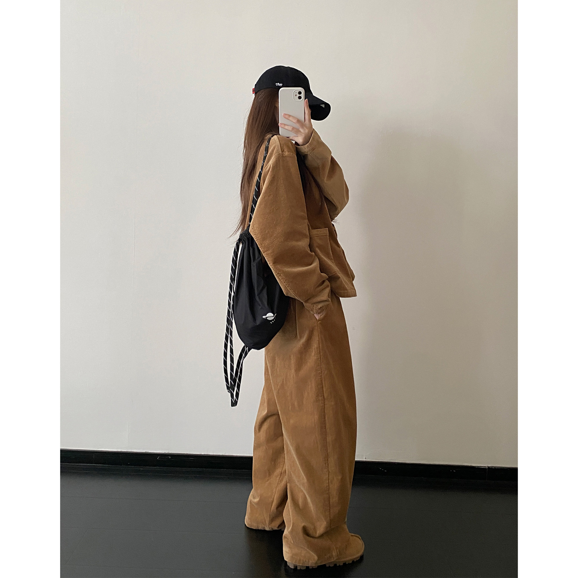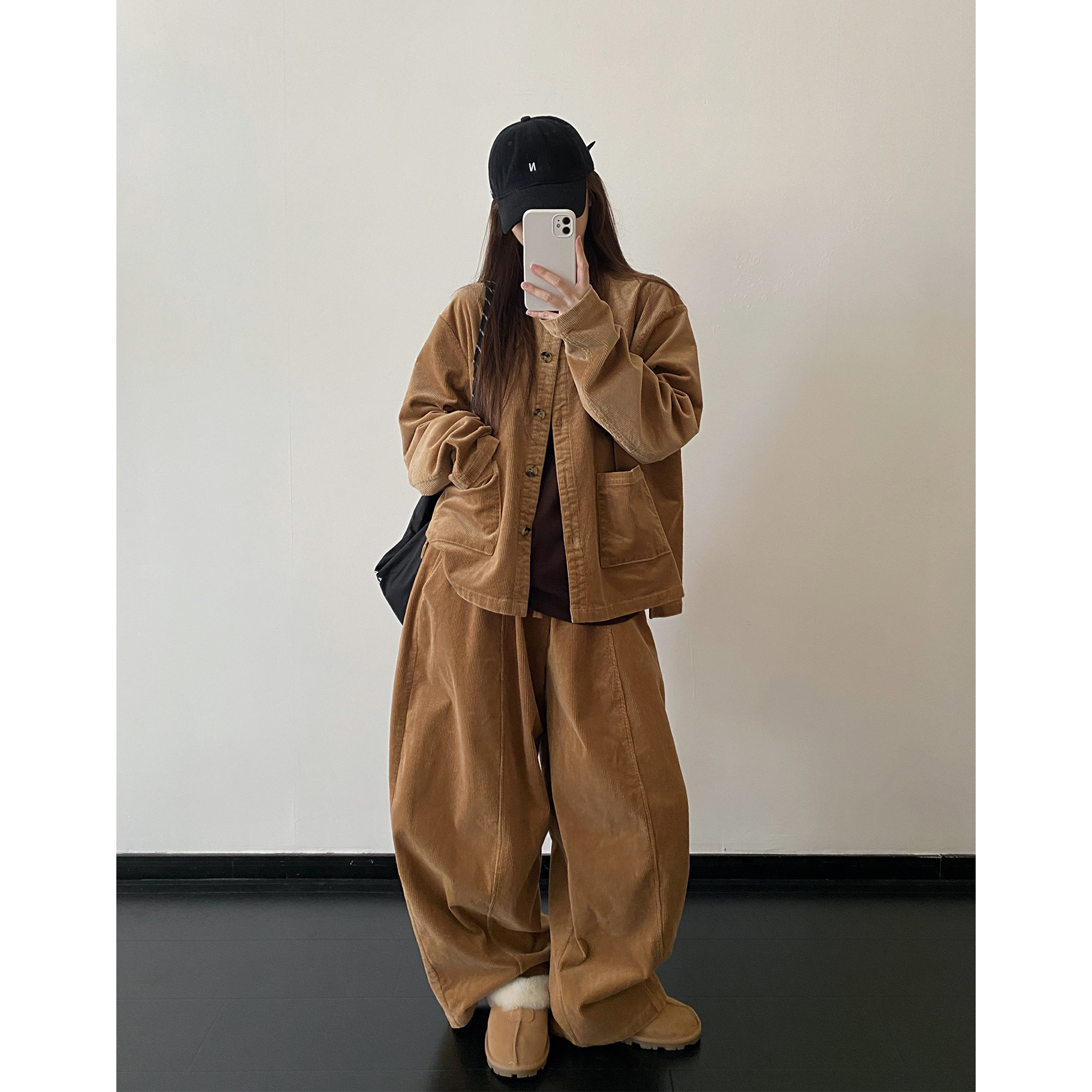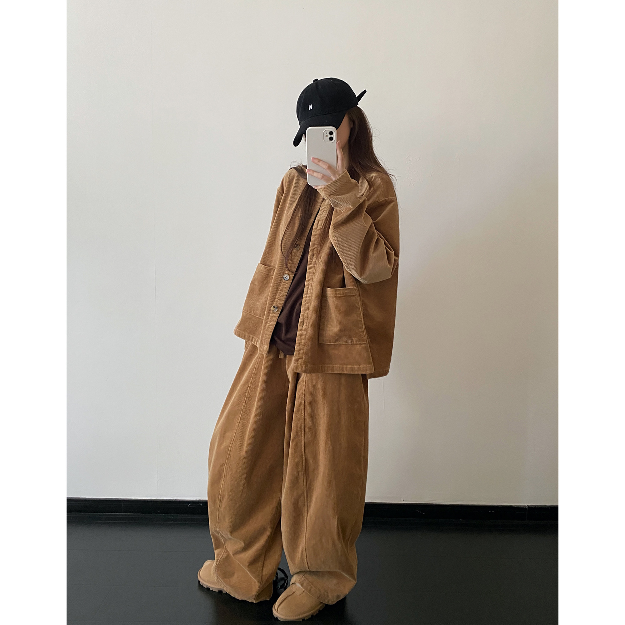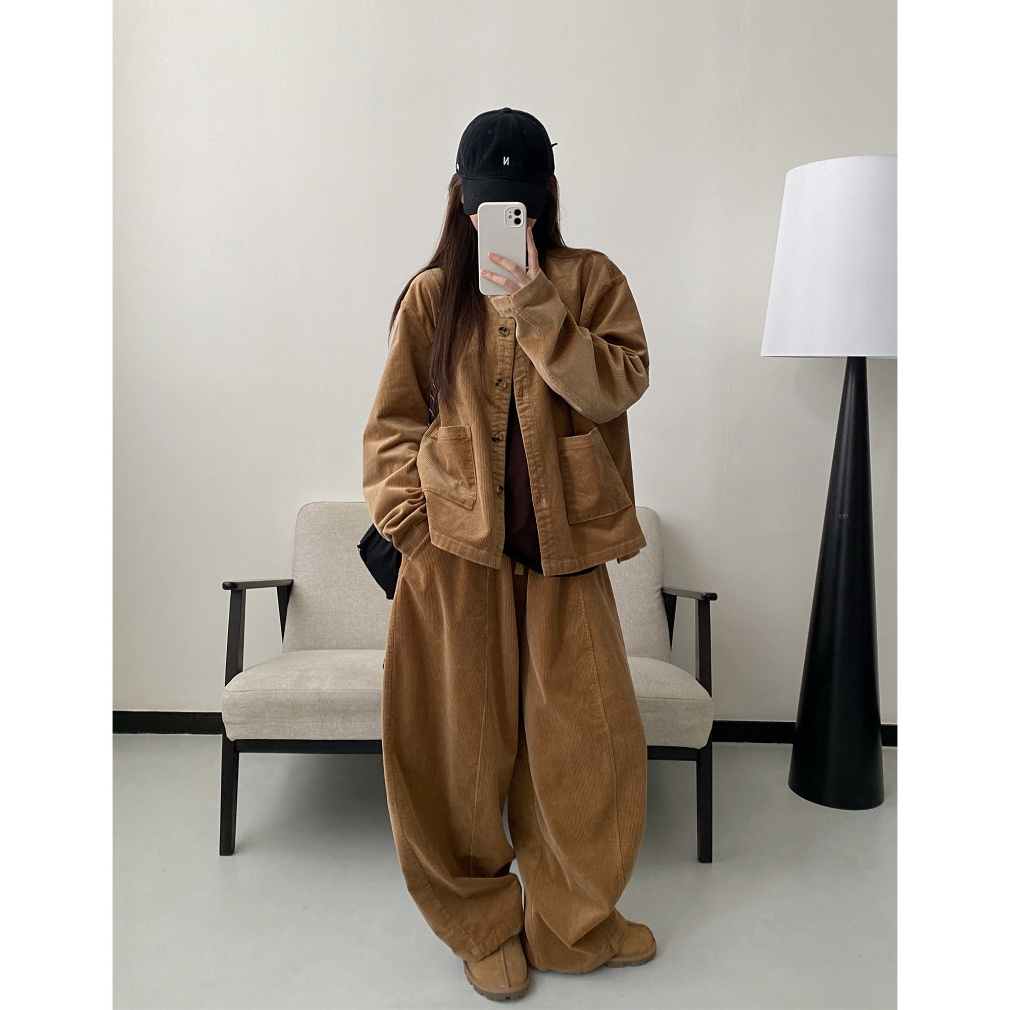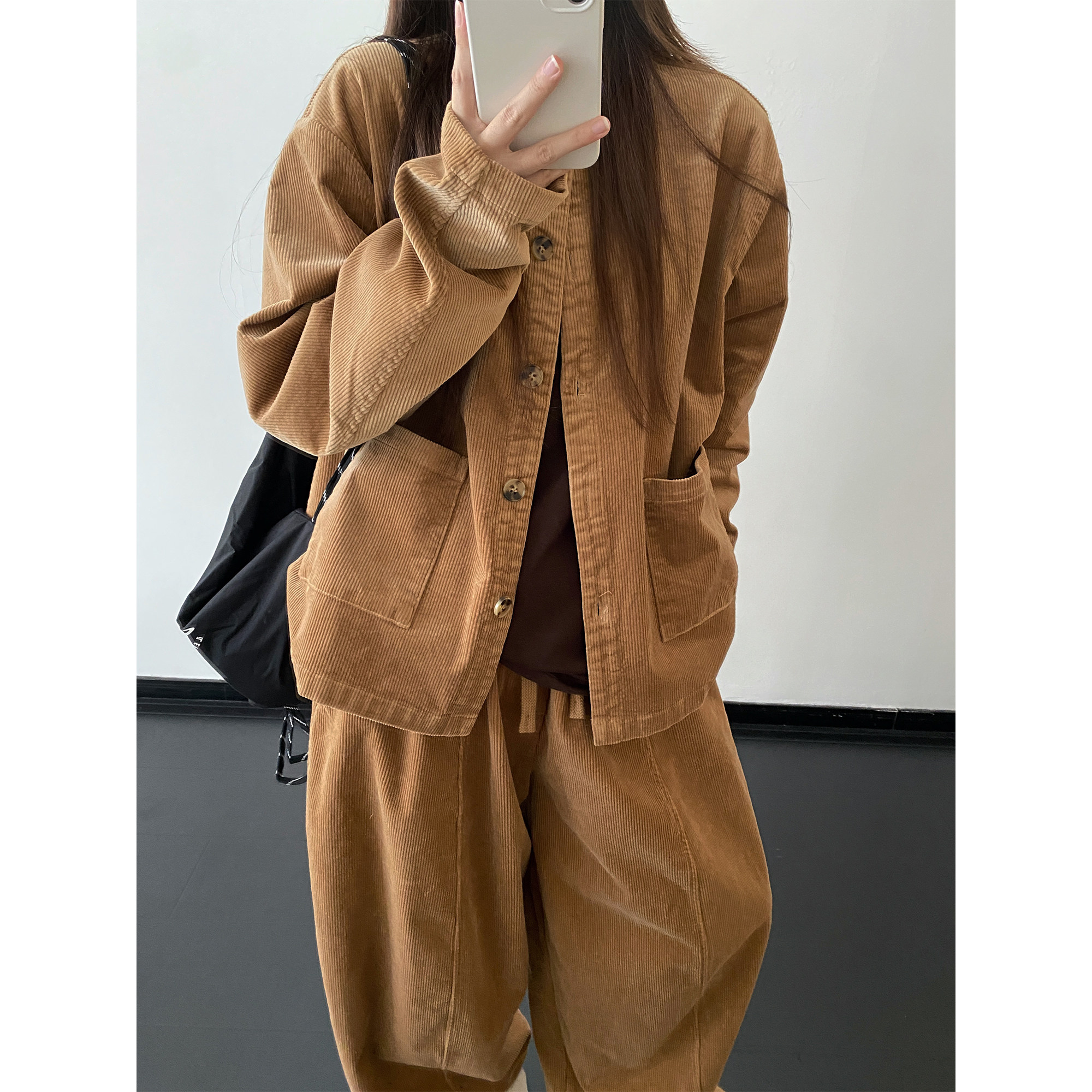 Вельветовое пальто с круглым воротником, комплект, штаны, куртка, оверсайз, эластичная талия