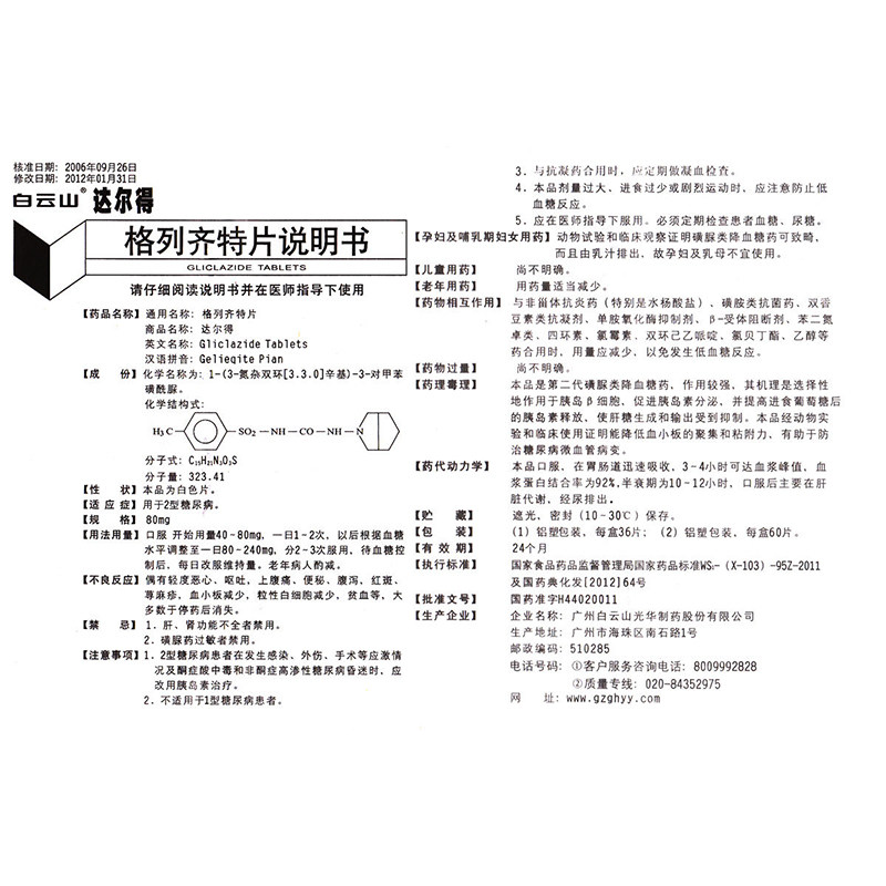 白云山 Дарде Гликлазид таблетки 80мг*60 таблеток/коробка