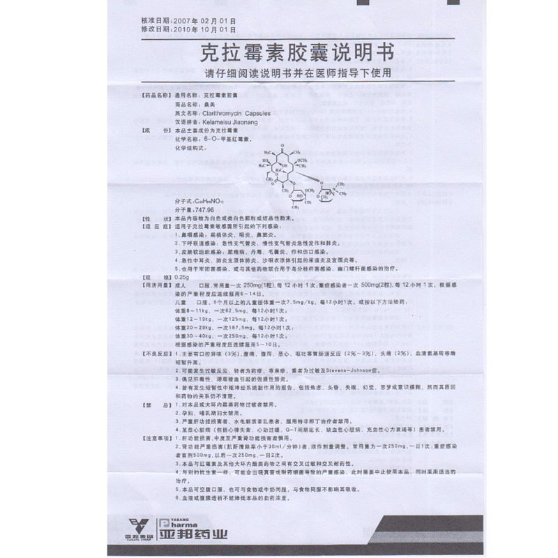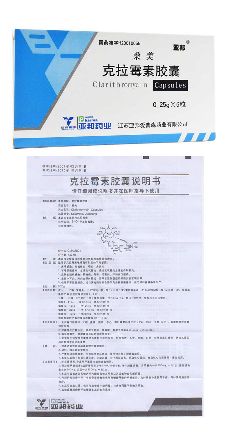 亚邦 Sangmei Кларитромицин Капсулы 0,25 г*6 капсул/коробка