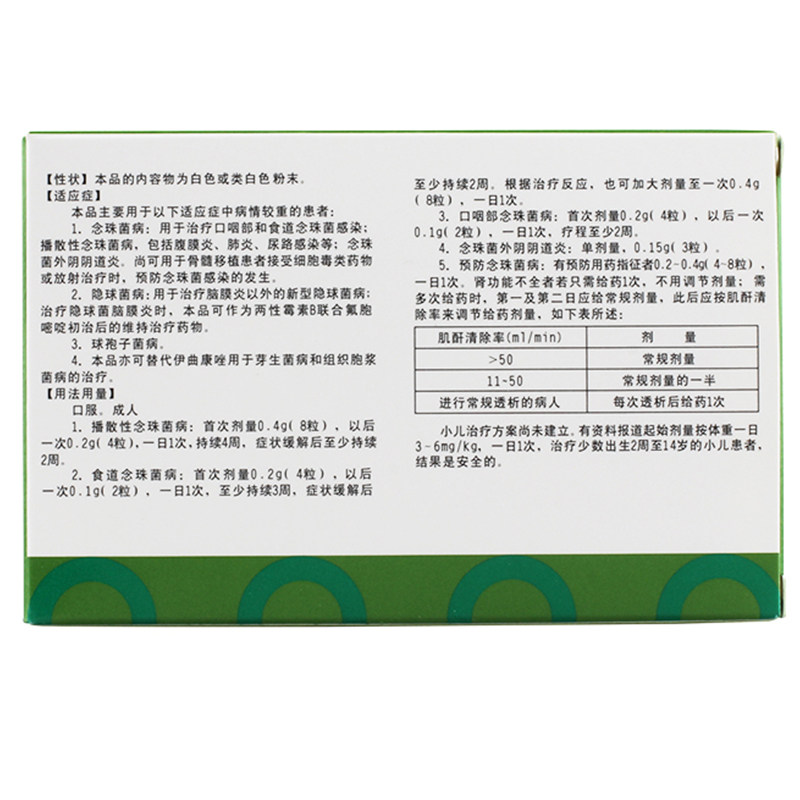 【Показания】Этот продукт в основном используется для пациентов с более тяжелыми заболеваниями в следующих адаптивных симптомах: 1. Болезнь кандиды: используется для лечения пероральной глотки и инфекции жемчуга в пищеводе; ПолемЭто все еще может предотвратить возникновение инфекции Candida, когда ее можно использовать для пациентов с трансплантацией костного мозга для пациентов с цитотоксическими препаратами или радиационным лечением.2. Cinobacteria: он используется для лечения новых типов кроссовых бактерий, кроме менинга;3. Бербальная болезнь.4. Он используется для профилактического лечения пациентов с химиотерапией, лучевой терапией и иммунодепрессивным лечением.5. Этот продукт также может заменить лечение Heuszole при гемиазе и заболевании цитоплазмы тканей.