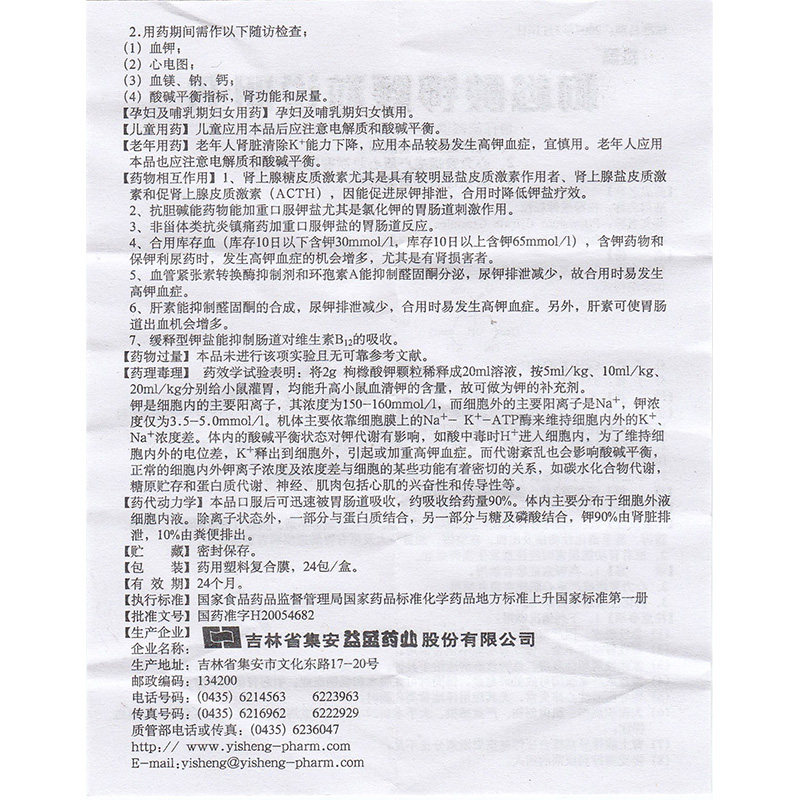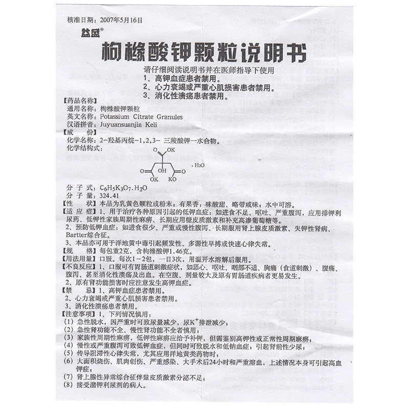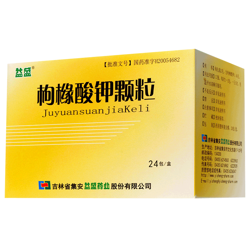 益盛 Гранулы цитрата калия 2 г: 1,46 г*24 упаковки/коробка. Лечит гипокалиемию, вызванную различными причинами. Предотвращает гипокалиемию. Может использоваться при частых экстрасистолиях из нескольких источников, вызванных отравлением наперстянкой.