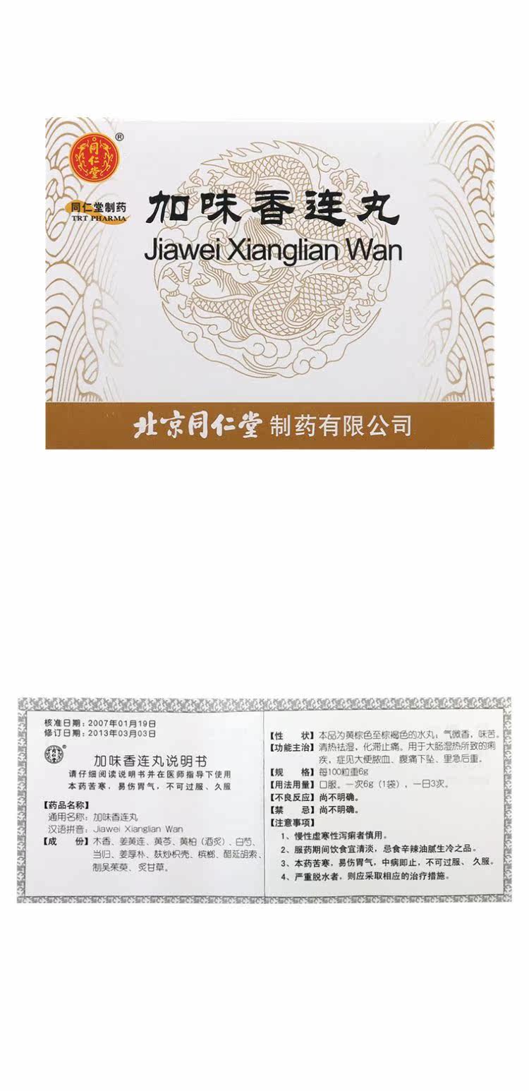 同仁堂 Gami Siang Lian Wan 6G*12 мешков/коробки прозрачная тепло, сырость, стагнация и анальгетик, который используется для дизентерии, вызванной дизентерией, вызванной большой кишкой и дизентерией.