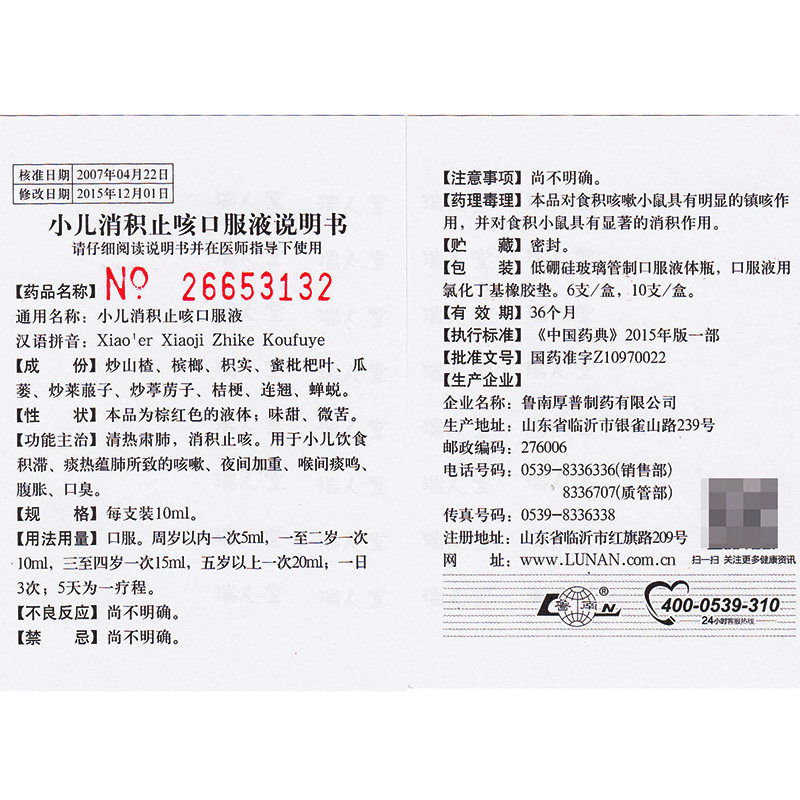 鲁南 Педиатрическое накопление кашля пероральной жидкости 10 мл*10 опоры/ящик для устранения кашля, кашля, накопления пищи кашля KX