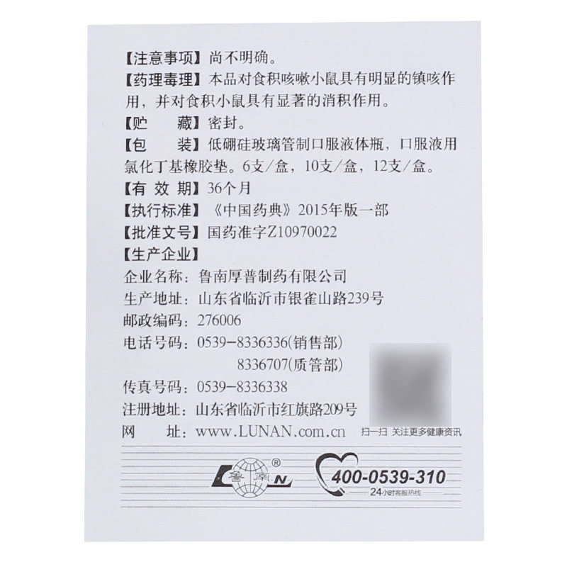 鲁南 Педиатрическое накопление кашля пероральной жидкости 10 мл*10 опоры/коробка с накоплением детской пищи.
