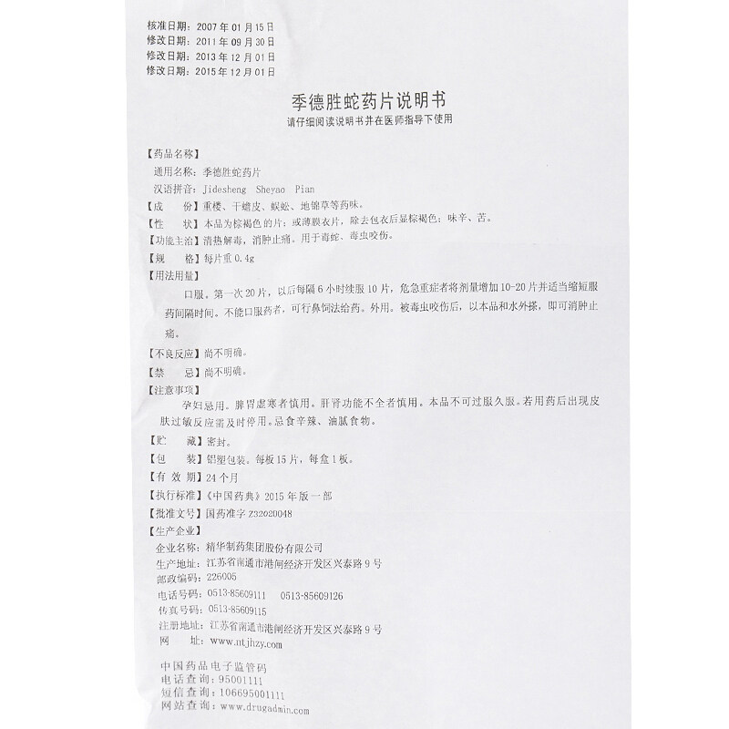 季德胜 Таблетки для змеи Jidesheng 0,4 г*15 таблетки/коробка