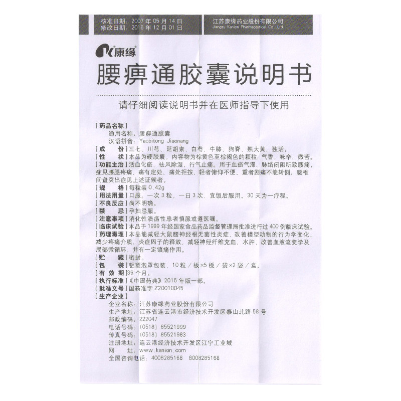 康缘 Поясничный паралич капсулы 0,42 г*100 Гребки с поясничной дискарацией Прог, подчеркивая кровавую кровь и удаляя стаз, удаляя ветер, осушиление талии и боли в ногах