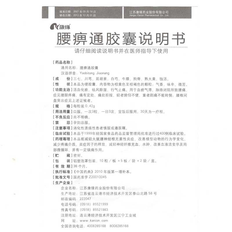 康缘 Капсула поясничного паралича 0,42 г*100 капсулы/коробка