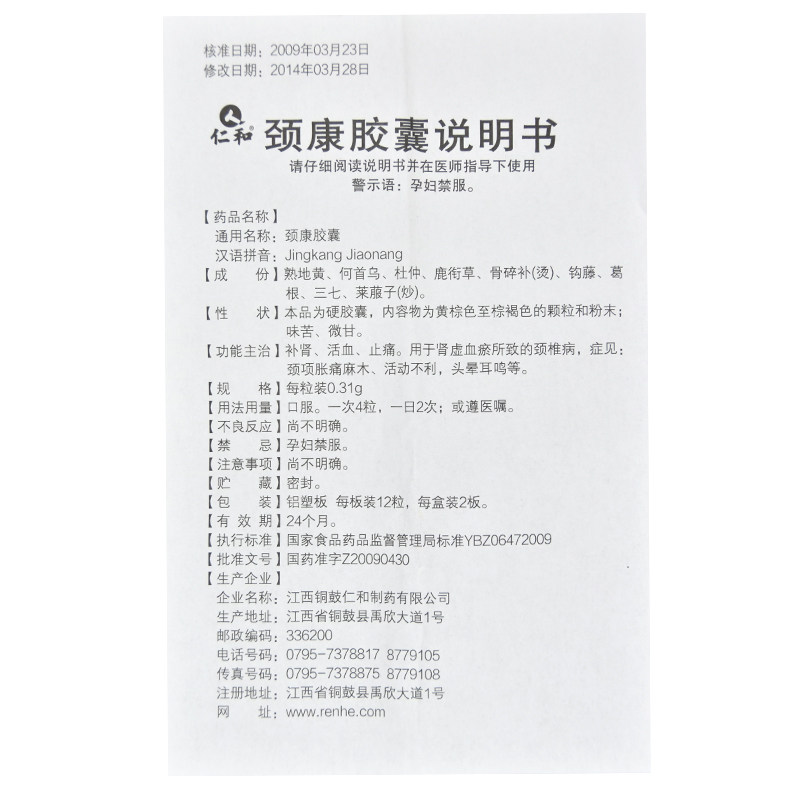 Бесплатная доставка] капсулы щины renhe -gear kang 0,31 г*24 капсулы/шейный спондилоз, в ушах, шума в ушах, боль в шее, онемение и онемение, дефицит почек и задержка крови, активирование почек крови