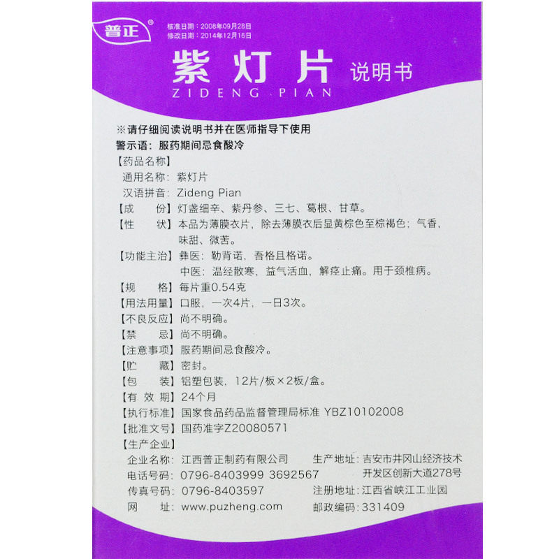 普正 Таблетки фиолетовой лампы 0,54 г*24 таблетки/коробка теплый меридиан Дисперсия Холод, активируя кровь Ци, устранение спазма и снятие шейного спондилоза