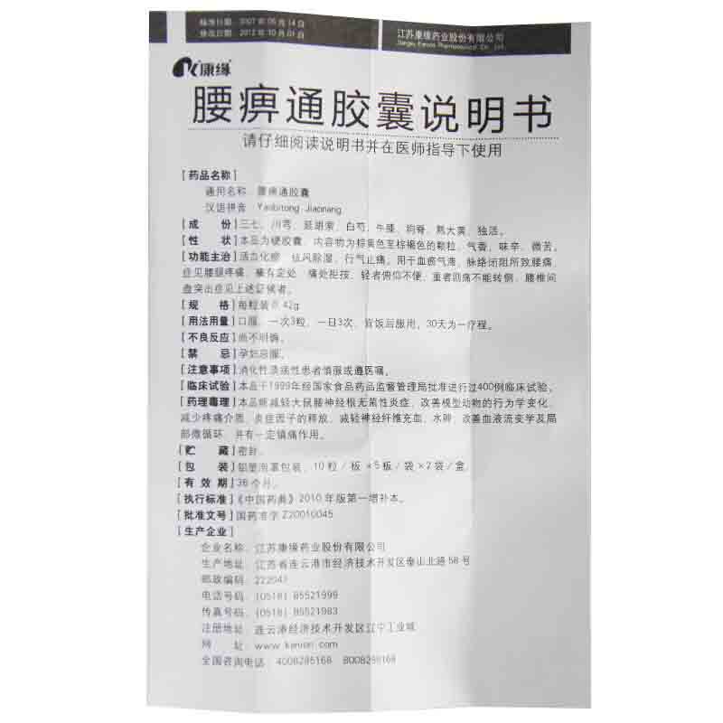 康缘 Капсула поясничного паралича 0,42 г*100 капсулы/ящик, способствующие кровообращению, удаление ветра, осушиление, осушиление вен, закрытие боли в талии и ноги.