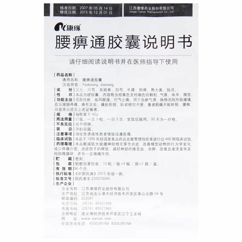 康缘 Поясничный паралич капсулы 0,42 г*30 Капсулы/Удаление коробки, беспрепятственный межпозвоночный диск, выступающий в крови, застой крови, облегчение боли, мышцы талии, талия и боль в ногах, влажный и влажный ашиат