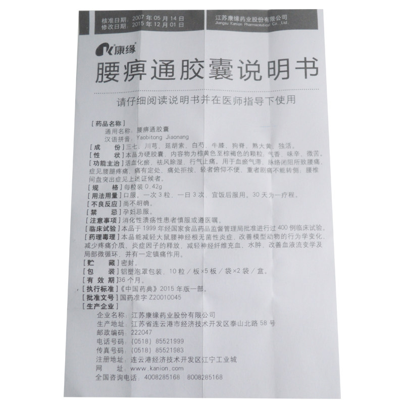 康缘 Капсула поясничного паралича 0,42 г*100 капсулы/коробка с болью поясничной и боли в ногах. Существует фиксированное место для боли для неудобства для поясничного диска.