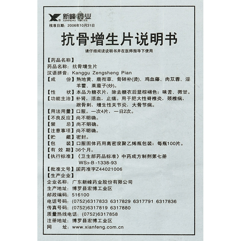 新峰 Антионо -гиперплазия таблетки 100 таблеток*1 бутылка/коробка Тоническая почечная кровообращение и облегчение боли, гипертрофический спондилит шейный спондилоз и костяные шпоры Гиперплас Артрит