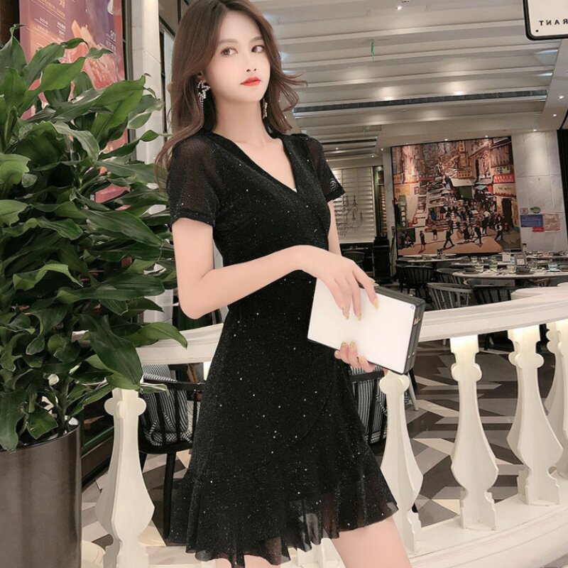 Сексуальная летняя приталенная мини-юбка, платье, коллекция 2021, яркий броский стиль, короткий рукав, V-образный вырез, с акцентом на бедрах