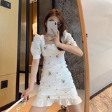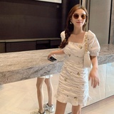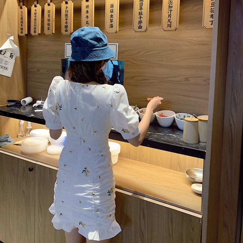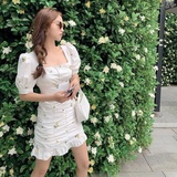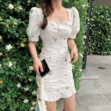 Приталенное летнее платье, приталенная юбка, французский стиль, цветочный принт, рукава фонарики, квадратный вырез, крой «рыбий хвост», с акцентом на бедрах