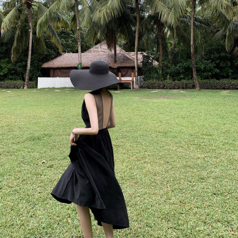 Ретро пляжное платье, длинная юбка, 2020, французский ретро стиль, V-образный вырез, с открытой спиной