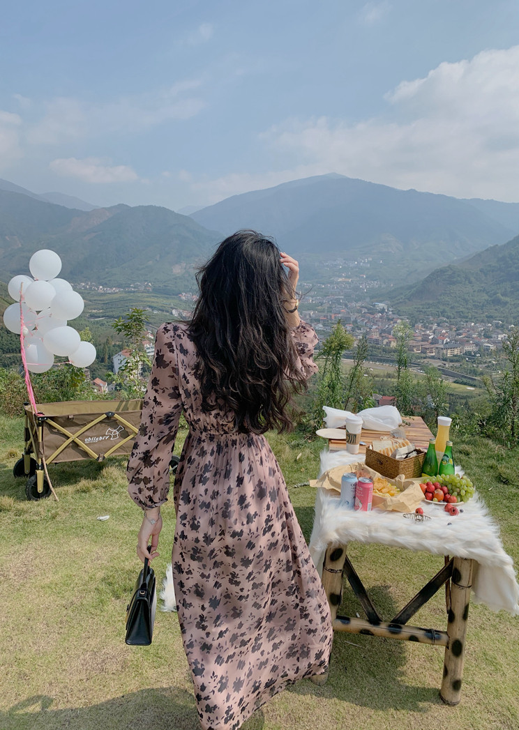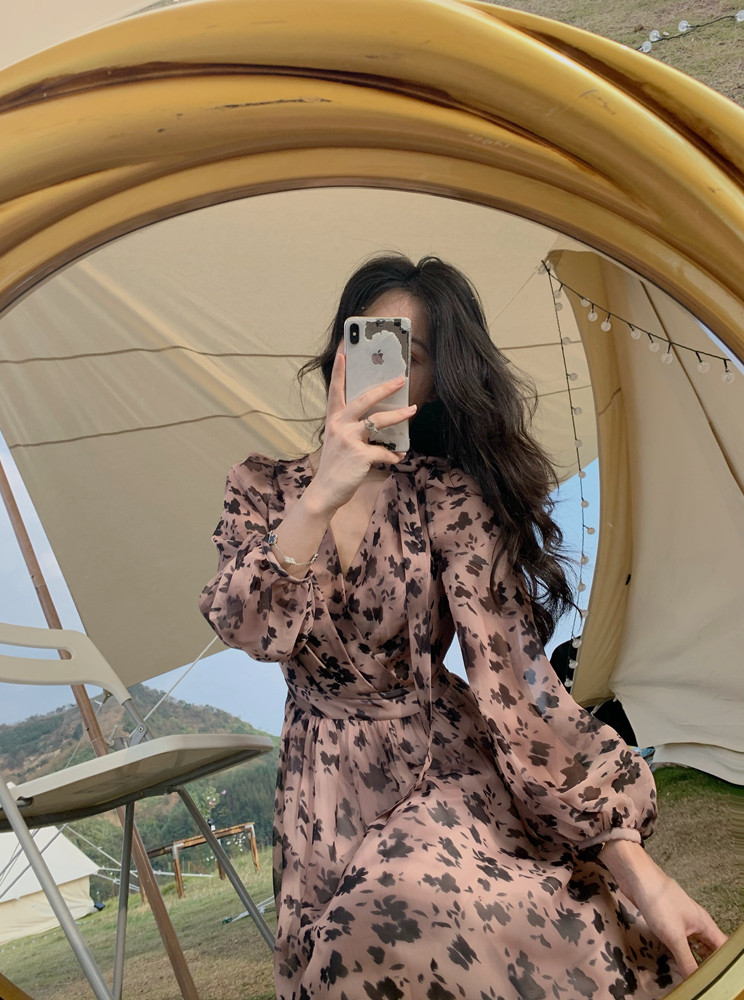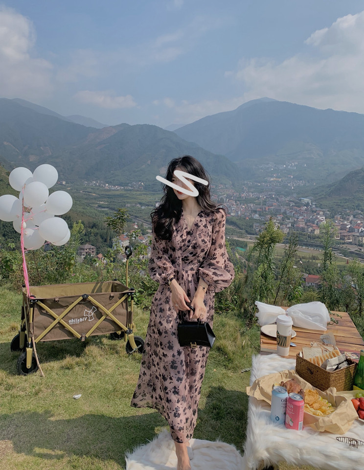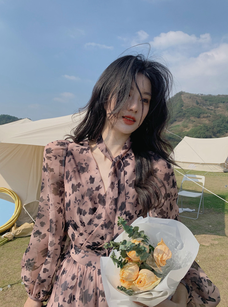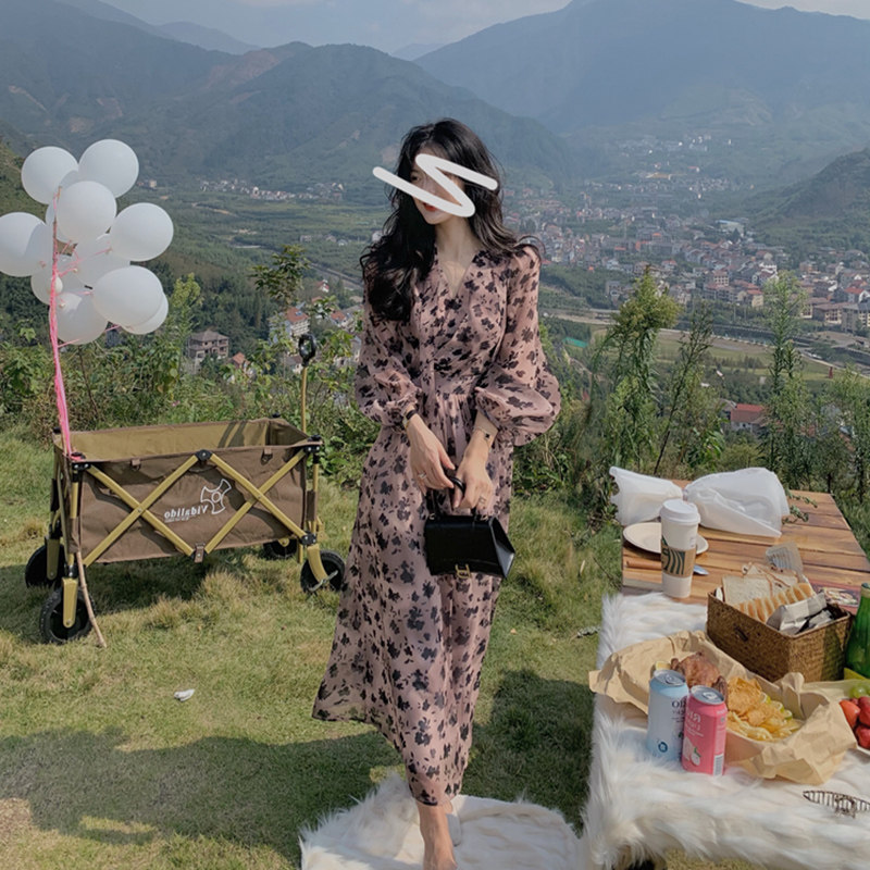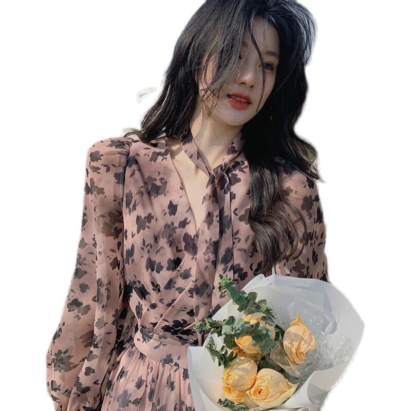 home daily Платье, шифоновая длинная юбка, коллекция 2021, французский стиль, яркий броский стиль, по фигуре, цветочный принт