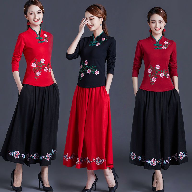 Демисезонный этнический лонгслив, юбка, комплект, этнический стиль, оверсайз, из хлопка и льна