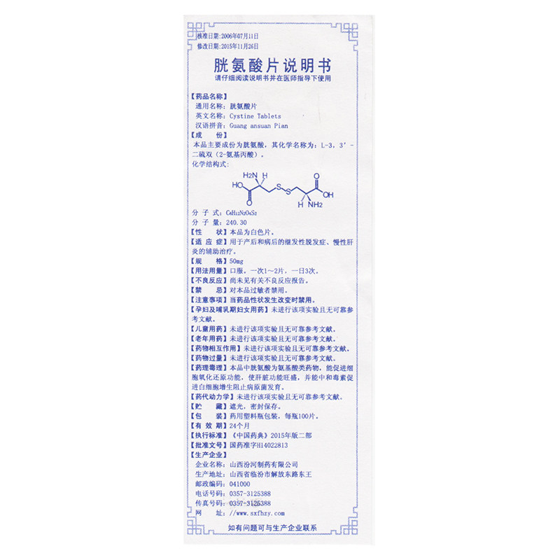 汾河 Цистин таблетки 50мг*100табл/флакон для адъювантного лечения хронического гепатита