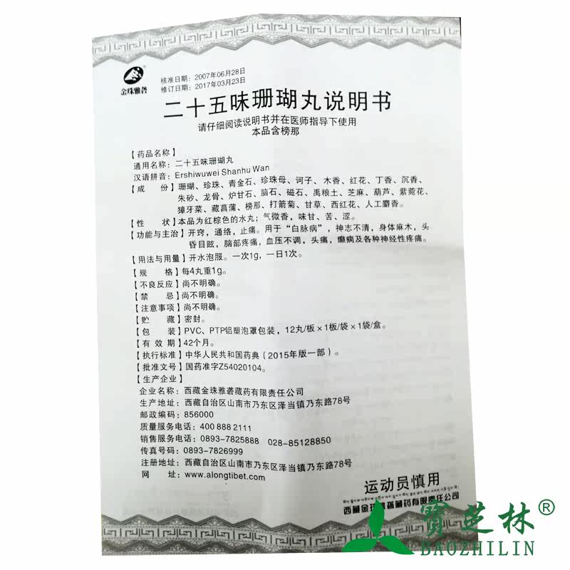 金珠雅砻 Двадцать пять ароматов таблеток коралловых таблеток 0,25 г*12 таблетки/ящик эпилепсия неврома головная боль