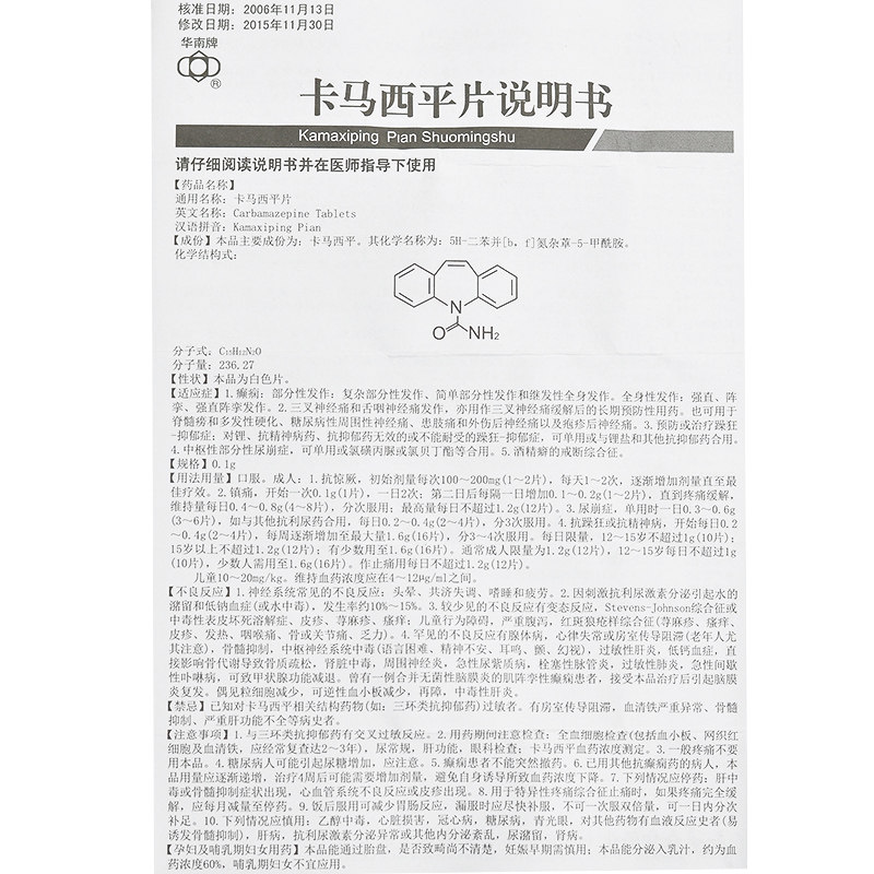 华南牌 Камари пинг -таблицы 0,1 г*100 таблеток/бутылочных тройничных невралгии и боль в глоточном нервом лиге также используются в виде длинных профилактических препаратов после боли в нервном нервах.