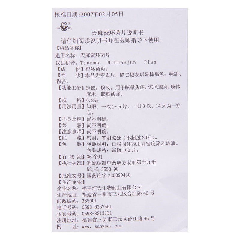 SY/三元 Gastrodia Honey Cytoskilum 0,25G*100 Таблетки/бутылка используются для ветреной эпилепсии, головокружения, головокружения, головной боли, этики конечностей, талии и колена