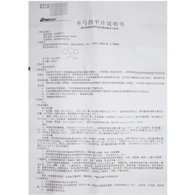 HWA/恩华 Камаси пинг -пленка 0,1 г*100 Таблетки*1 бутылка/коробка/коробка эпилепсия частичная приступовая тригеминальная невралгия и боль в скартальном нерва