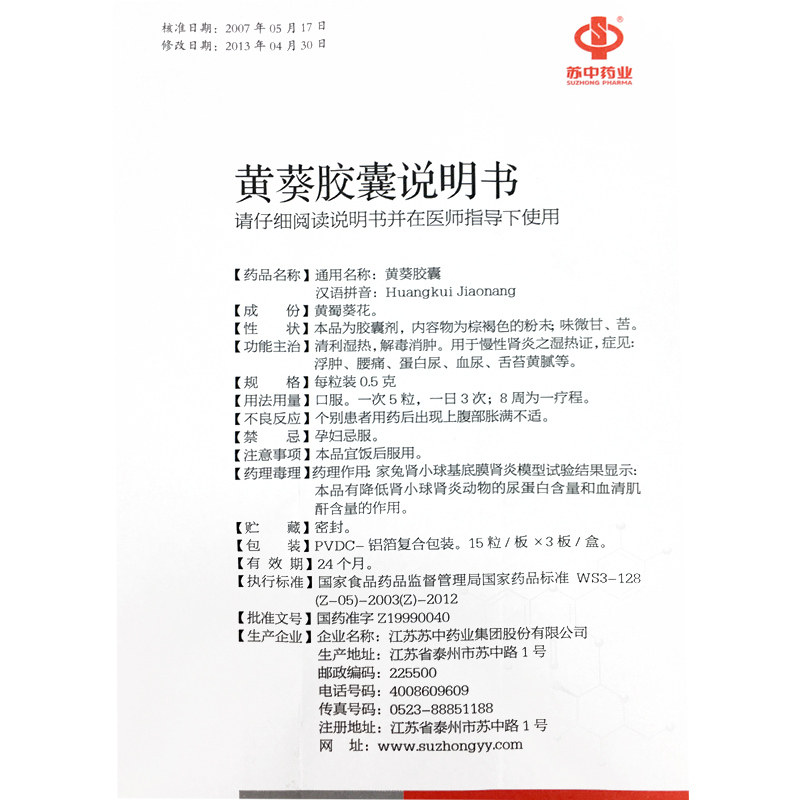 Аутентичная бесплатная доставка] Капсулы Suzhong Huangkui 0,5 г*45 капсулы/коробка гематурия нефрит прозрачная сырость и тепло детоксикация и уменьшают отек хронический нефрит Эпидемия боли в пояснице.
