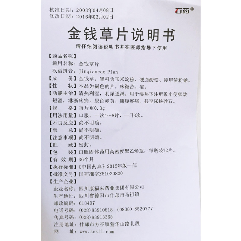 石药 Деньги трава пленка 0,3 г*72 таблетки*1 бутылка/коробка с влажным теплом Цинли Диуретик -розовый, подходящий для разбавленной боли, талии и боли в животе и т. Д.