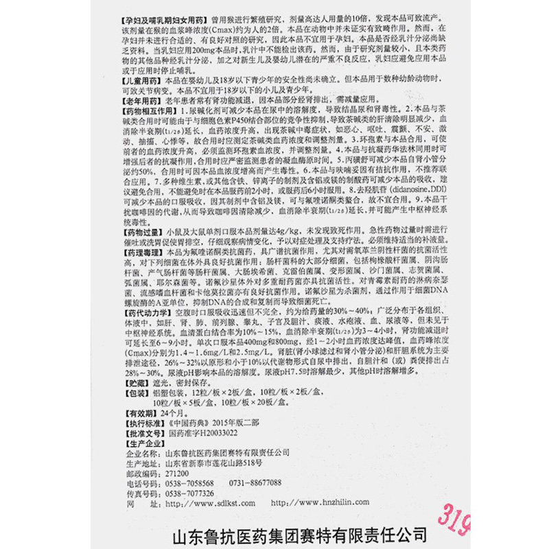 鲁抗 Капсула норфлоксацина 0,1 грамма*20 капсул/ящик Комплексные инфекции мочевывод